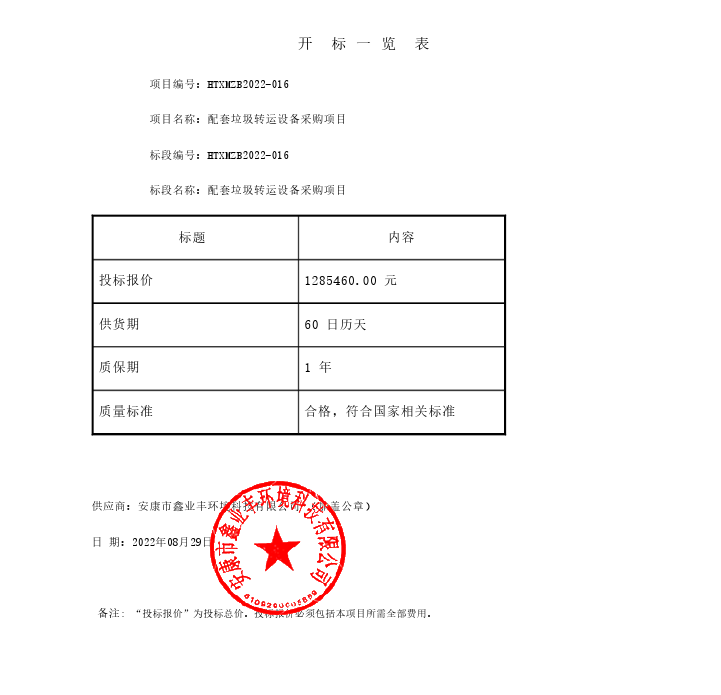 ----------------------------------招标机构发布信息原文:----------------------- <meta http-equiv="content-type" content="text/html;charset=utf-8"> 一、项目编号:HTXMZB2022-016 二、项目名称:配套垃圾转运设备采购项目 三、采购结果 合同包1(配套垃圾转运设备采购项目):