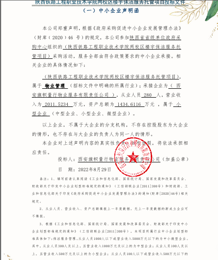 自本公告发布之日起1个工作日。 八、其他补充事宜专门面向中小企业 九、凡对本次公告内容提出询问,请按以下方式联系。 1.采购人信息名称:陕西铁路工程职业技术学院 地址:陕西省渭南市站北街东段一号 联系方式:0913-2221395 2.采购代理机构信息名称:陕西省省级单位政府采购中心 地址:西安市碑林区长安北路14号陕西省公共资源交易中心 联系方式:029-88661302 3.项目联系方式项目联系人:赵老师 电话:029-88661302 陕西省省级单位政府采购中心 2022年08月31日 相关附件: 陕西铁路工程职业技术学院两校区楼宇保洁服务托管项目中标(成交)明细.pdf 分项报价表.pdf 中小企业声明函.png 十一、其他事项: ------------------------------------招标信息结束---------------------------- 标签: 项目 中标 陕西 楼宇 职业技术学院 校区 铁路工程 上一篇: 2022年8月31日关于翰卿村幕头角落至后湖历山太阳能路灯安装采购项目(招标编号:AXDC2022A024)的中标公告 最新5000条招标信息列表: 滚动招标 |