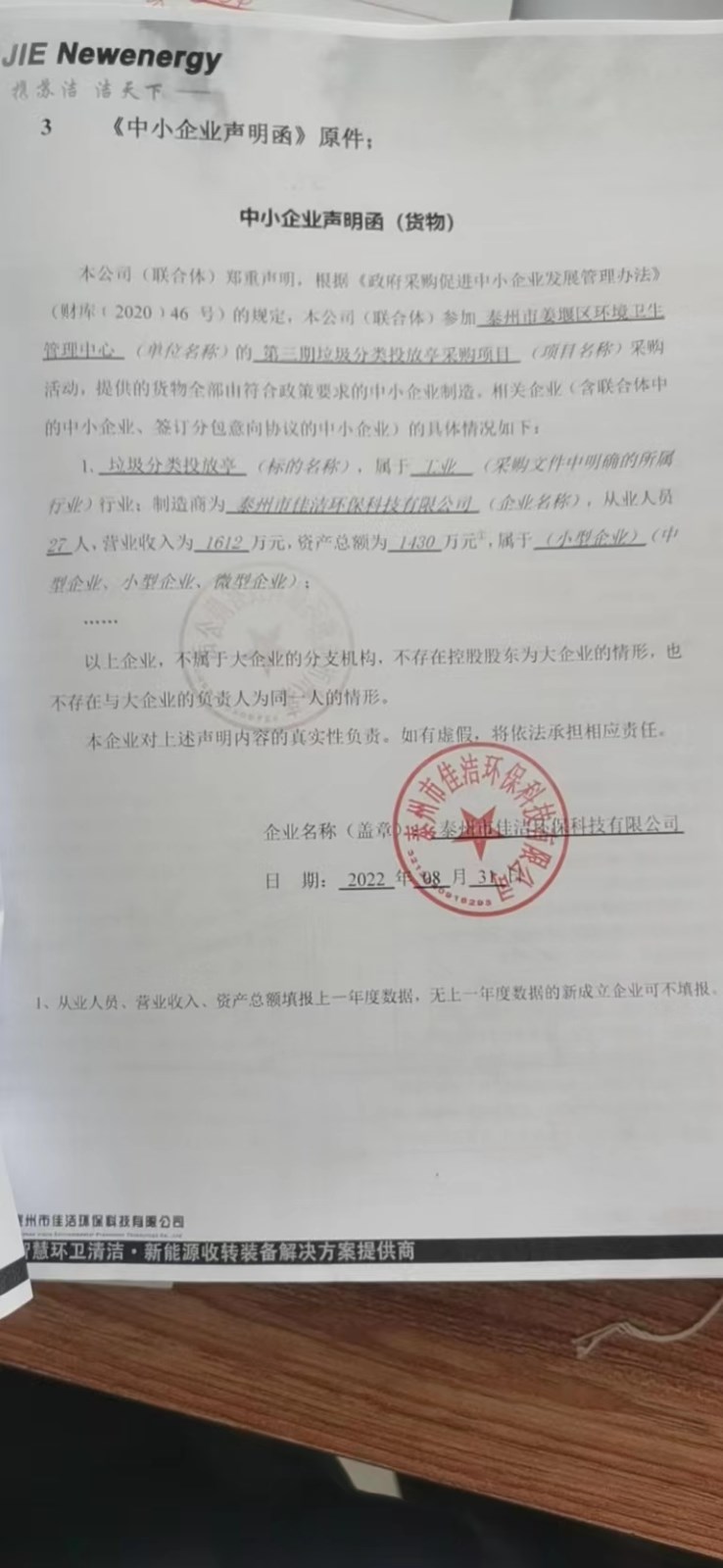 第四标段: 供应商名称:泰州市佳洁环保科技有限公司 供应商地址:泰州市姜堰区白米镇曙光工业园区内