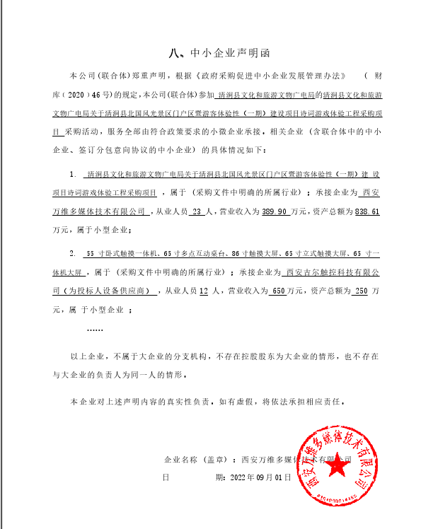 自本公告发布之日起1个工作日。 八、其他补充事宜无 九、凡对本次公告内容提出询问,请按以下方式联系。 1.采购人信息名称:清涧县文化和旅游文物广电局 地址:清涧县西城区文广中心 联系方式:15667694777 2.采购代理机构信息名称:华睿诚项目管理有限公司 地址:陕西省榆林市榆林大道富源大厦6楼综合办公室 联系方式:0912-3623000 3.项目联系方式项目联系人:杨女士 电话:15353190523 华睿诚项目管理有限公司 2022年09月01日 相关附件: 清涧县文化和旅游文物广电局关于清涧县北国风光景区门户区暨游客体验性(一期)建设项目诗词游戏体验工程采购项目中标(成交)明细.pdf 中小企业声明函.jpg 招标文件 游戏体验工程采购项目(1).docx 十一、其他事项: ------------------------------------招标信息结束---------------------------- 标签: 项目 工程 采购 中标 清涧县 景区 北国 上一篇: 2022年9月1日黑龙江中医药大学附属第一医院医院食堂改造项目结果公告 最新5000条招标信息列表: 滚动招标 |
