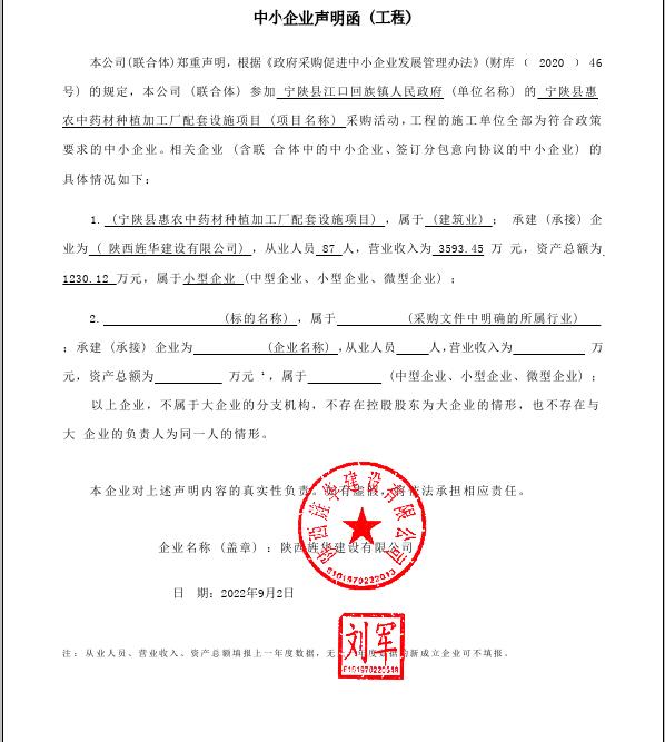 合同包1(宁陕县惠农中药材种植加工厂配套设施项目): 工程类(陕西旌华建设有限公司)