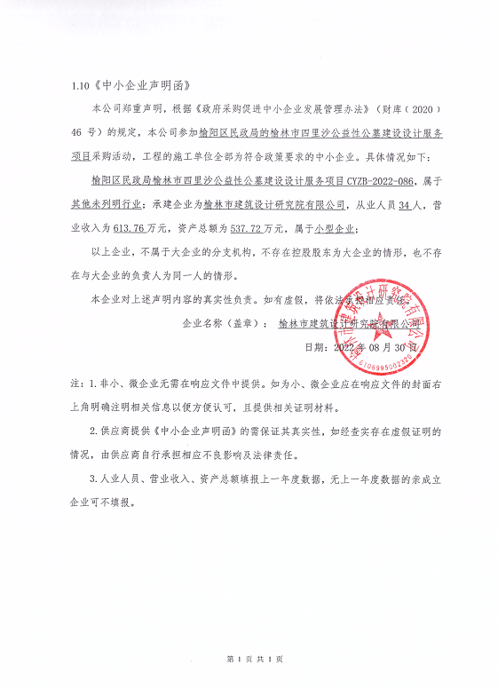 自本公告发布之日起1个工作日。 八、其他补充事宜/ 九、凡对本次公告内容提出询问,请按以下方式联系。 1.采购人信息名称:榆阳区民政局 地址:榆林大道166号区政府114室 联系方式:0912-3525055 2.采购代理机构信息名称:陕西创源项目管理有限公司 地址:榆林市高新区安居路14号金叶小区一楼商铺 联系方式:0912-3448777 3.项目联系方式项目联系人:纪瑜 电话:15619910006 陕西创源项目管理有限公司 2022年09月05日 相关附件: 榆阳区民政局榆林市四里沙公益性公墓建设设计服务项目中标(成交)明细.pdf 中小企业声明函.png 086榆阳区四里沙公墓设计服务.doc 十一、其他事项: ------------------------------------招标信息结束---------------------------- 标签: 中标 榆林市 民政局 公墓 服务项目 公告 榆阳区 上一篇: 2022年9月5日韩城市职业中等专业学校学生餐厅改造工程中标(成交)结果公告 最新5000条招标信息列表: 滚动招标 |