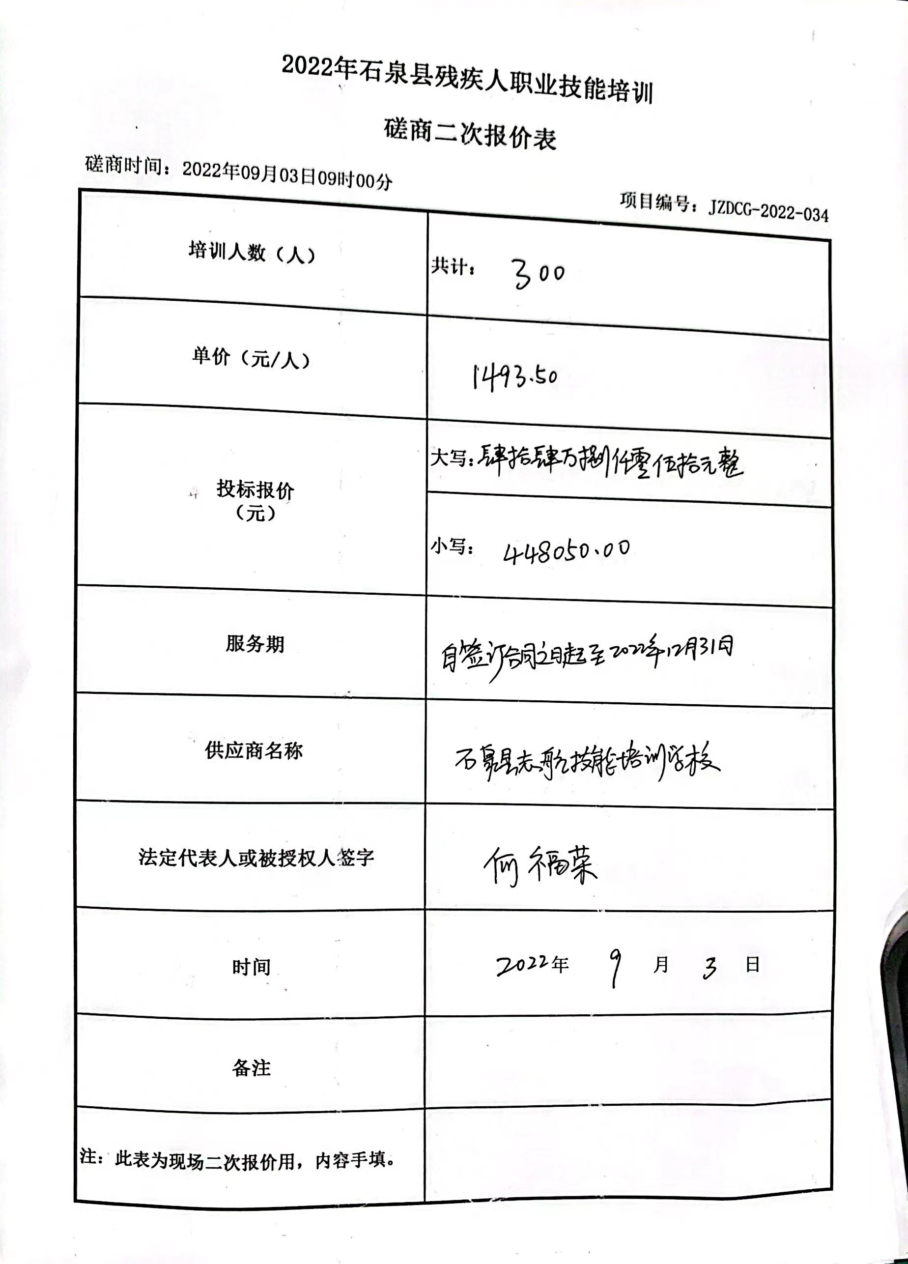 自本公告发布之日起1个工作日。 八、其他补充事宜/ 九、凡对本次公告内容提出询问,请按以下方式联系。 1.采购人信息名称:石泉县残疾人联合会 地址:陕西省安康市石泉县城关镇春潮广场创投中心10楼 联系方式:0915-6321376 2.采购代理机构信息名称:陕西金准达项目管理有限责任公司 地址:陕西省西安市高新区科技五路3号橡树星座B座902室 联系方式:029-89555599 3.项目联系方式项目联系人:王工 电话:029-89555599 陕西金准达项目管理有限责任公司 2022年09月05日 相关附件: 石泉县残疾人联合会2022年石泉县残疾人职业技能培训中标(成交)明细.pdf 竞争性磋商文件--2022年石泉县残疾人职业技能培训.docx 中小企业声明函.jpg 二次报价表.jpg 十一、其他事项: ------------------------------------招标信息结束---------------------------- 标签: 中标 石泉县 残疾人 职业技能培训 公告 上一篇: 2022年9月5日哈尔滨市市场监督管理局信息系统外包服务结果公告 最新5000条招标信息列表: 滚动招标 |