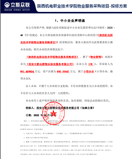 自本公告发布之日起1个工作日。 八、其他补充事宜无 九、凡对本次公告内容提出询问,请按以下方式联系。 1.采购人信息名称:陕西机电职业技术学院 地址:宝鸡市宝福路56号 联系方式:13571703169 2.采购代理机构信息名称:陕西省省级单位政府采购中心 地址:西安市碑林区长安北路14号 联系方式:02988661306 3.项目联系方式项目联系人:王芸熙 电话:17792928785 陕西省省级单位政府采购中心 2022年09月07日 相关附件: 中小企业声明函.png 陕西机电职业技术学院物业服务采购项目中标(成交)明细.pdf 分项报价表1.png 分项报价表2.png 十一、其他事项: ------------------------------------招标信息结束---------------------------- 标签: 项目 采购 陕西 中标 职业技术学院 物业服务 公告 上一篇: 2022年9月7日山东省潍坊市安丘市青云学府更换变压器项目中标(成交)公告 最新5000条招标信息列表: 滚动招标 |