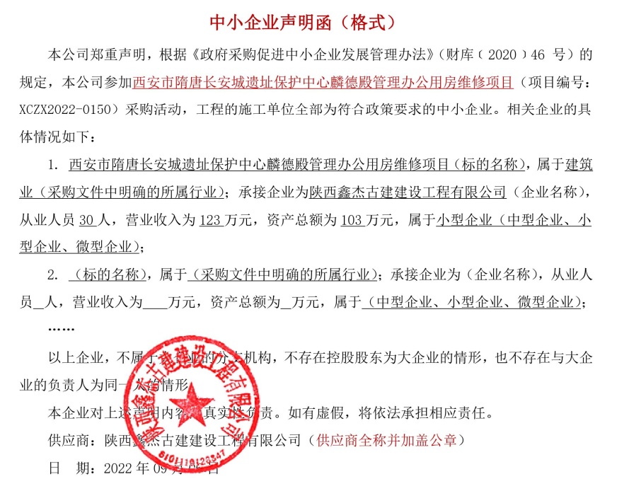 自本公告发布之日起1个工作日。 八、其他补充事宜1、本项目为专门面向中小企业采购项目,成交供应商性质详见附图。 2、请成交供应商于本项目公告期届满之日起前往西安市公共资源交易中心八楼领取成交通知书,同时须提交密封好的纸质响应文件一正两副,内容与电子响应文件完全一致。 九、凡对本次公告内容提出询问,请按以下方式联系。 1.采购人信息名称:西安市隋唐长安城遗址保护中心 地址:龙首北路东段1号 联系方式:029-81623198 2.采购代理机构信息名称:西安市市级单位政府采购中心 地址:西安市未央区文景北路16号白桦林国际B座 联系方式:029-86510091/86510092/86510093 3.项目联系方式项目联系人:李老师、纪老师 电话:80858、80862 西安市市级单位政府采购中心 2022年09月07日 相关附件: 西安市隋唐长安城遗址保护中心麟德殿管理办公用房维修项目中标(成交)明细.pdf XCZX2022-0150西安市隋唐长安城遗址保护中心麟德殿管理办公用房维修项目.doc XCZX2022-0150关于西安市隋唐长安城遗址保护中心麟德殿管理办公用房维修项目的成交公告.docx 中小企业声明函.jpg 十一、其他事项: ------------------------------------招标信息结束---------------------------- 标签: 项目 西安市 办公用房 隋唐 遗址 长安城 公告 上一篇: 2022年9月7日府谷县智能一氧化碳报警器采购安装项目中标(成交)结果公告 最新5000条招标信息列表: 滚动招标 |