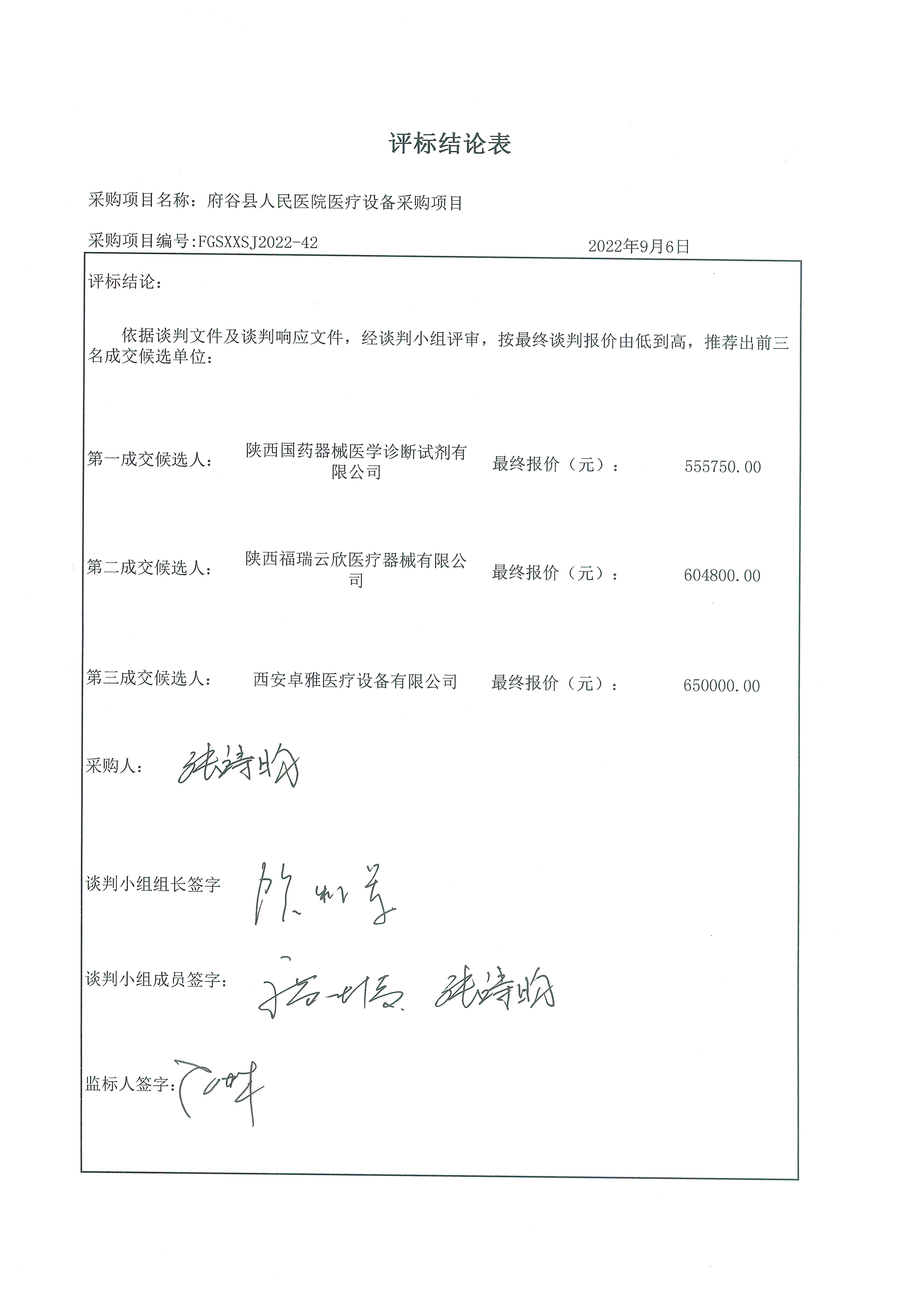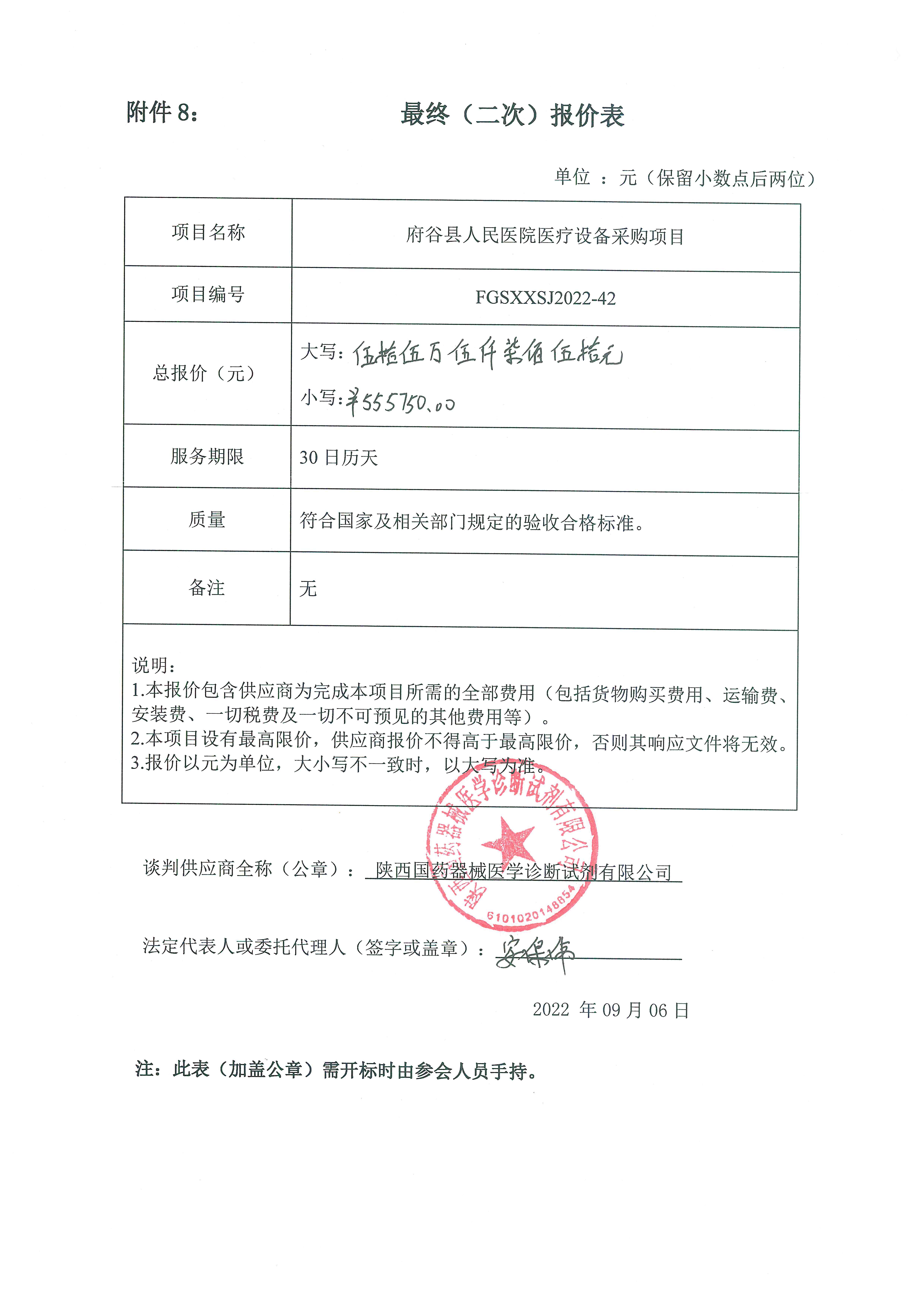 自本公告发布之日起1个工作日。 八、其他补充事宜/ 九、凡对本次公告内容提出询问,请按以下方式联系。 1.采购人信息名称:府谷县人民医院 地址:府谷县康复路上巷2号 联系方式:15353387882 2.采购代理机构信息名称:陕西新世纪工程管理咨询有限公司 地址:陕西省榆林市府谷县创业大厦四楼436室 联系方式:0912-8808689 3.项目联系方式项目联系人:李工 电话:18992206759 陕西新世纪工程管理咨询有限公司 2022年09月08日 相关附件: 府谷县人民医院府谷县医疗设备的采购中标(成交)明细.pdf 评标结论表.jpg 二次报价表.jpg 42-谈判文件-【县医院设备采购】-修改.pdf 十一、其他事项: ------------------------------------招标信息结束---------------------------- 标签: 中标 项目 府谷县 人民医院 设备采购 医疗 公告 上一篇: 2022年9月8日富平县梅家坪镇人民政府(本级)梅家坪镇庙沟村巷道硬化及排水项目中标(成交)结果公告 最新5000条招标信息列表: 滚动招标 |