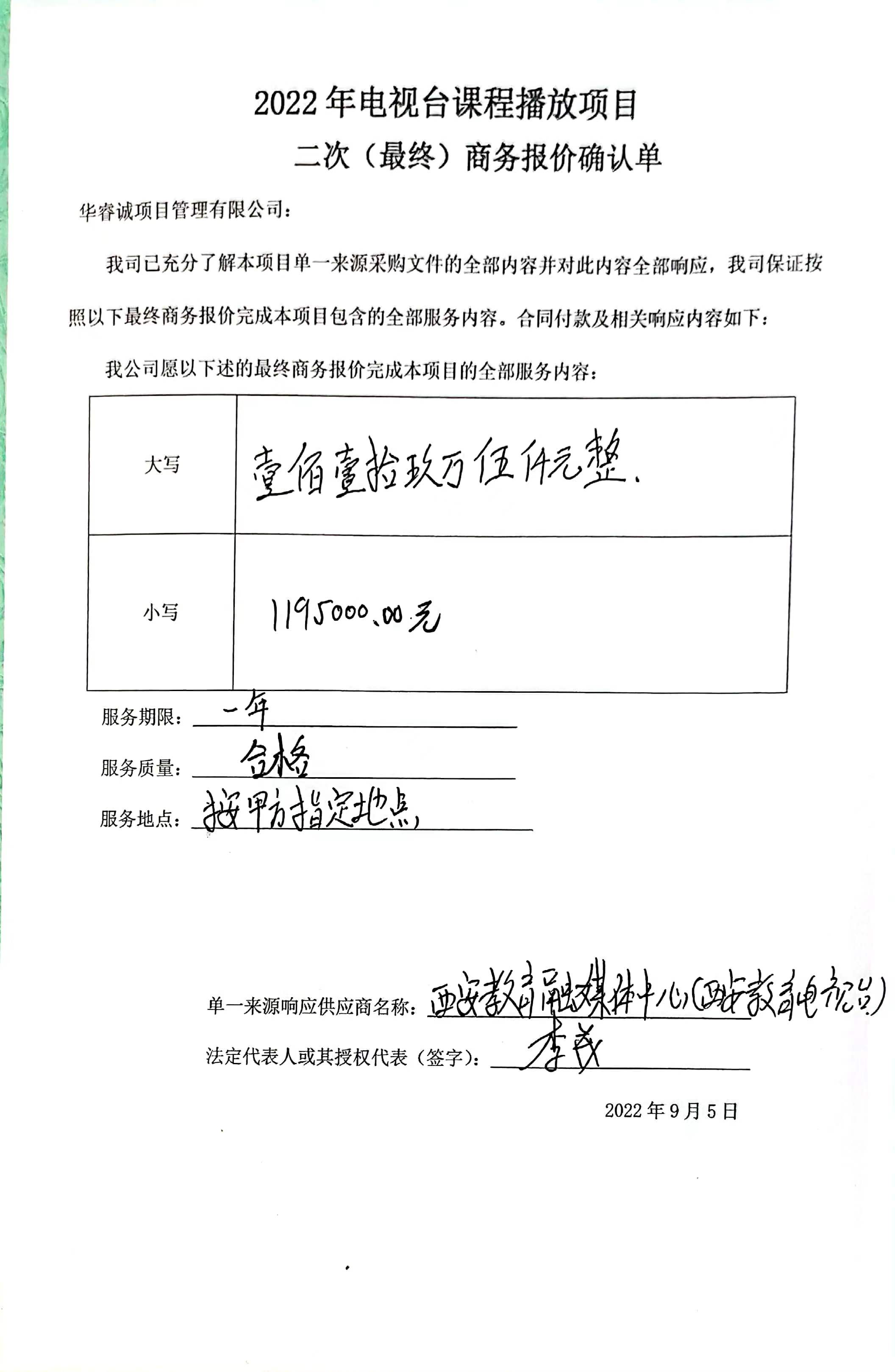 自本公告发布之日起1个工作日。 八、其他补充事宜/ 九、凡对本次公告内容提出询问,请按以下方式联系。 1.采购人信息名称:西安开放大学 地址:陕西省西安市碑林区金花南路11号 联系方式:029-83233140 2.采购代理机构信息名称:华睿诚项目管理有限公司 地址:陕西省西安市曲江新区雁翔路3269号旺座曲江E座29层 联系方式:15388630382 3.项目联系方式项目联系人:冯工 电话:15388630382 华睿诚项目管理有限公司 2022年09月08日 相关附件: 西安开放大学2022年电视台课程播放项目中标(成交)明细.pdf 单一来源采购文件(西开大教育电视台播放)-发布稿.pdf 最终报价单.jpg 十一、其他事项: ------------------------------------招标信息结束---------------------------- 标签: 项目 中标 西安 电视台 课程 公告 大学 上一篇: 2022年9月8日聊城市文物事业服务中心分支机构安保、保洁、第三方委托等服务项目中标(成交)公告 最新5000条招标信息列表: 滚动招标 |