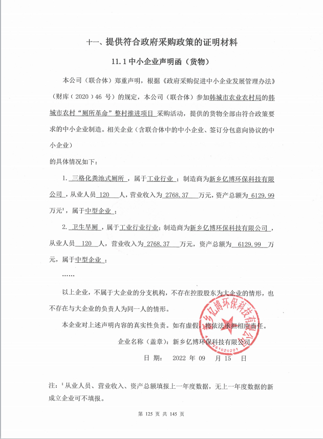 合同包1(韩城市农村“厕所革命”整村推进项目): 货物类(新乡亿博环保科技有限公司)