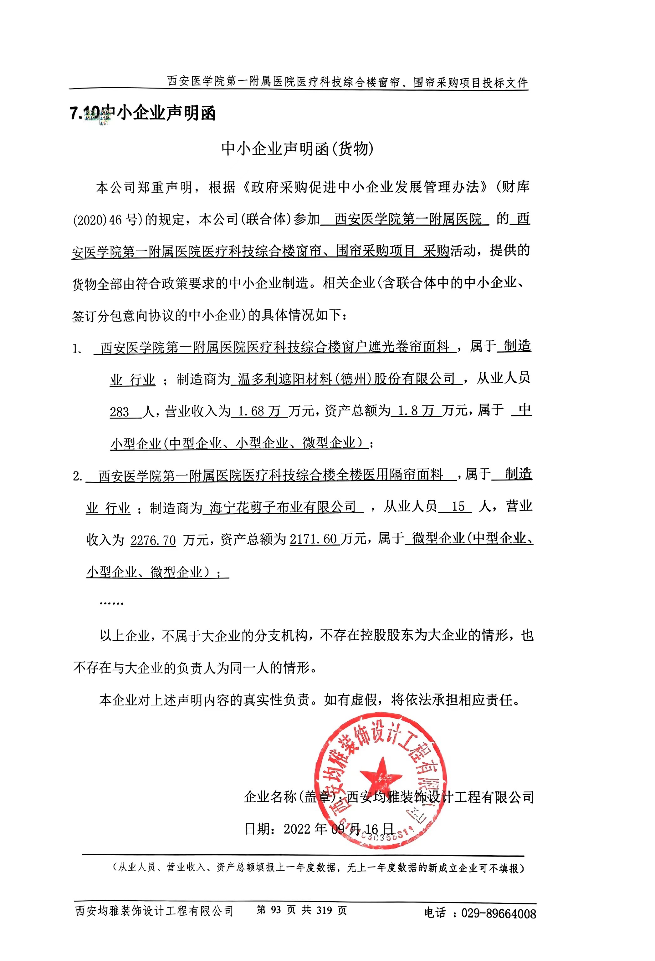 自本公告发布之日起1个工作日。 八、其他补充事宜无 九、凡对本次公告内容提出询问,请按以下方式联系。 1.采购人信息名称:西安医学院第一附属医院 地址:陕西省西安市莲湖区沣镐西路48号 联系方式:029-84277525 2.采购代理机构信息名称:陕西省采购招标有限责任公司 地址:西安市高新二路山西证券大厦8层 联系方式:029-88497916 3.项目联系方式项目联系人:田婧 电话:029-88497916 陕西省采购招标有限责任公司 2022年09月19日 相关附件: 西安医学院第一附属医院医疗科技综合楼窗帘、围帘采购项目(二次)中标(成交)明细.pdf 标准政府采购项目招标文件(2022版)8.25.pdf 中小企业声明函.jpg 十一、其他事项: ------------------------------------招标信息结束---------------------------- 标签: 项目 采购 西安 中标 综合楼 医学院 窗帘 上一篇: 2022年9月19日临城县2022年度统筹整合使用财政涉农资金水利建设项目成交公告 最新5000条招标信息列表: 滚动招标 |