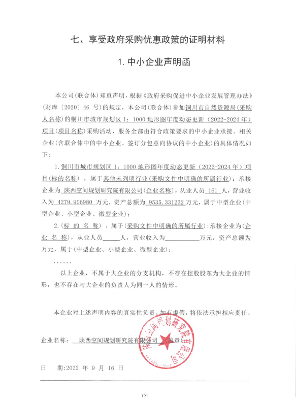 自本公告发布之日起1个工作日。 八、其他补充事宜无 九、凡对本次公告内容提出询问,请按以下方式联系。 1.采购人信息名称:铜川市自然资源局 地址:铜川市新区正阳路9号 联系方式:0919-3185720 2.采购代理机构信息名称:陕西中盈项目管理有限公司 地址:陕西省西安市经济技术开发区凤城一路泰德大厦6楼 联系方式:029-86217393 3.项目联系方式项目联系人:孙工 电话:029-86217393 陕西中盈项目管理有限公司 2022年09月19日 相关附件: 铜川市自然资源局铜川市城市规划区1:1000地形图年度动态更新(2022-2024年)项目中标(成交)明细.pdf 中小企业声明函.png 铜川市城市规划区11000地形图年度动态更新(2022-2024年)项目磋商文件.pdf 十一、其他事项: ------------------------------------招标信息结束---------------------------- 标签: 中标 项目 铜川市 地形图 城市规划 年度 公告 上一篇: 2022年9月19日白沙黎族自治县民政局-白沙黎族自治县养老服务中心公建民营项目-中标公告 最新5000条招标信息列表: 滚动招标 |