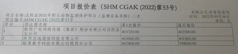 2022年9月20日汉阴县2021年野生动物监测保护项目(监测设备采购)(二次)中标(成交)结果公告 |