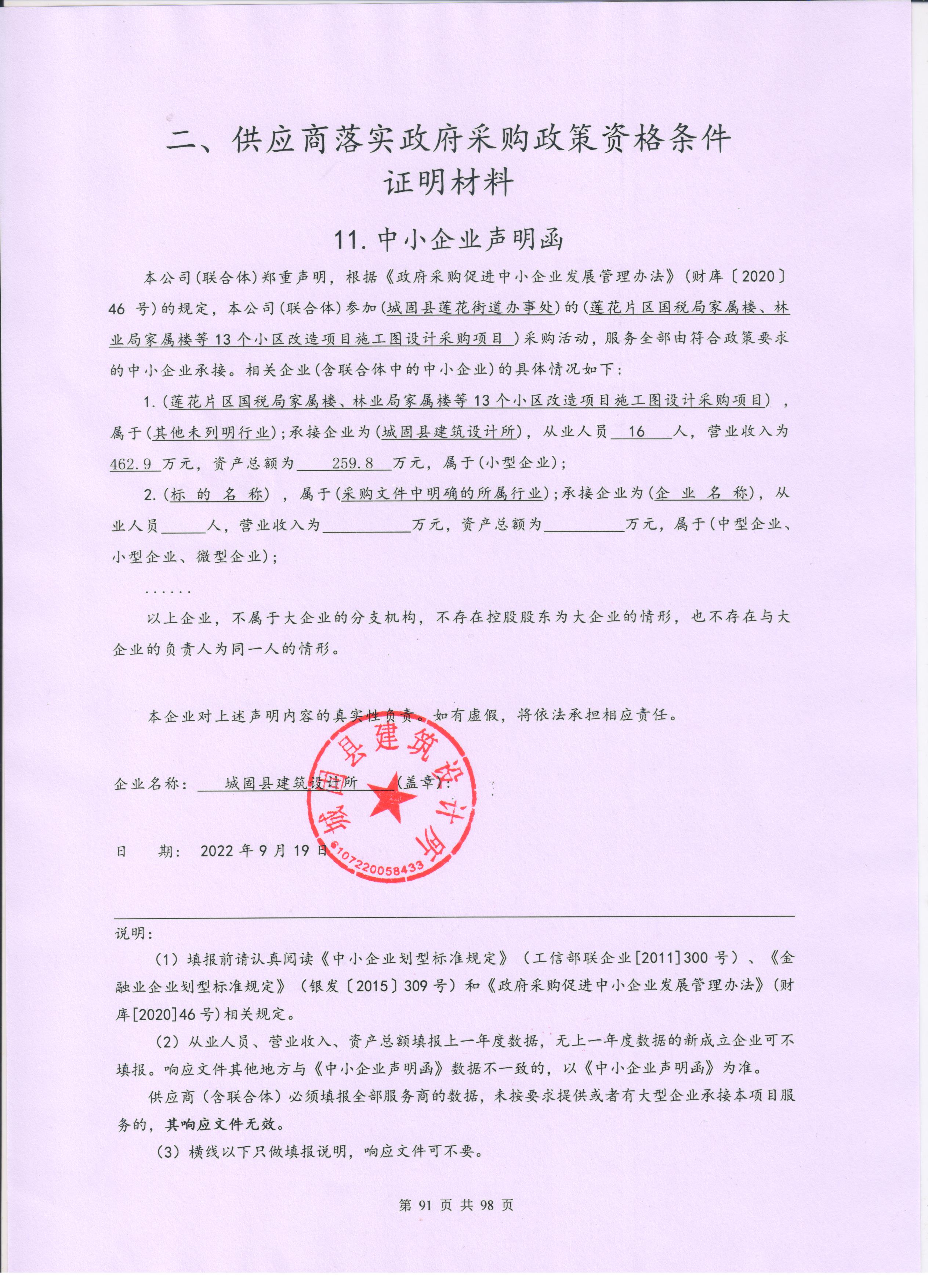 自本公告发布之日起1个工作日。 八、其他补充事宜城固县建筑设计所代理服务费为:7650元,汉中城镇规划建筑设计院代理服务费为:5760元 九、凡对本次公告内容提出询问,请按以下方式联系。 1.采购人信息名称:城固县莲花街道办事处 地址:城固县莲花街道办事处太古石路中段 联系方式:15929429098 2.采购代理机构信息名称:华智建项目管理有限公司 地址:西安市莲湖区丰庆路48号1幢308室 联系方式:17391792078 3.项目联系方式项目联系人:邓工 电话:17391792078 华智建项目管理有限公司 2022年09月20日 相关附件: 城固县莲花街道办事处莲花片区国税局家属楼、林业局家属楼等25个小区改造项目施工图设计采购项目中标(成交)明细.pdf 2包 莲花片区国税局家属楼、林业局家属楼等25个小区改造项目施工图设计采购项目竞争性磋商文件.pdf 莲花片区国税局家属楼、林业局家属楼等25个小区改造项目施工图设计采购项目竞争性磋商文件1包.pdf 2包中小企业申明函.jpg 1包中小企业申明函.pdf 十一、其他事项: ------------------------------------招标信息结束---------------------------- 标签: 莲花 采购 项目 中标 家属楼 城固县 林业局 上一篇: 2022年9月20日城固县莲花街道办事处莲花片区国税局家属楼、林业局家属楼等25个小区改造项目可研及初步设计采购项目中标(成交)结果公告 最新5000条招标信息列表: 滚动招标 |