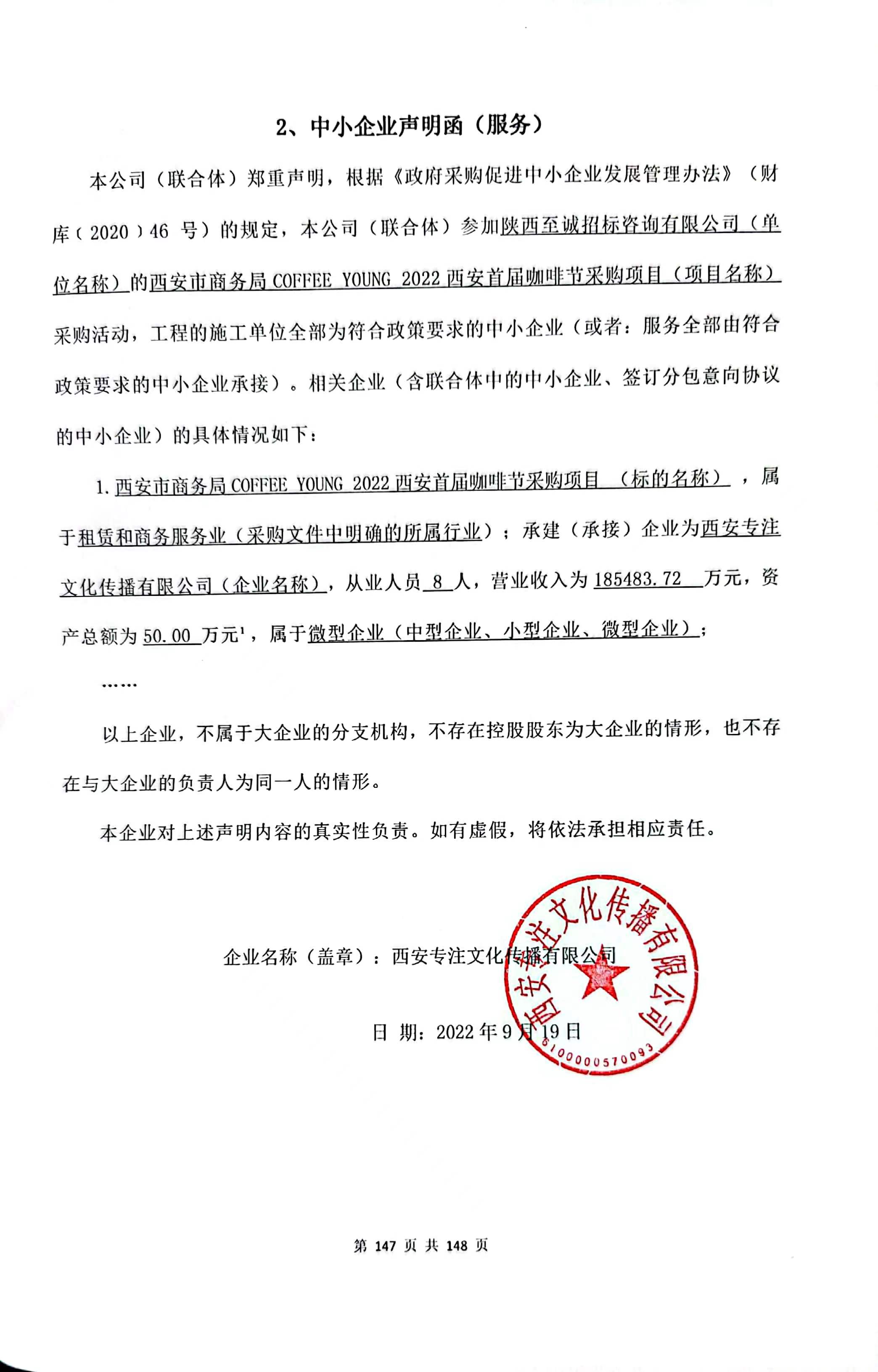 自本公告发布之日起1个工作日。 八、其他补充事宜第2包成交供应商为微型企业。 九、凡对本次公告内容提出询问,请按以下方式联系。 1.采购人信息名称:西安市商务局(本级) 地址:西安市未央区凤城八路109号 联系方式:029-86786531 2.采购代理机构信息名称:陕西至诚招标咨询有限公司 地址:陕西省西安市未央区未央路171-1 银池广场道拉斯财富中心 21 楼03室 联系方式:029-88219779 3.项目联系方式项目联系人:王越 电话:029-88219779 陕西至诚招标咨询有限公司 2022年09月20日 相关附件: 西安市商务局(本级)西安市商务局COFFEEYOUNG2022西安首届咖啡节采购项目中标(成交)明细.pdf 定稿---西安市商务局200首届咖啡节采购项目.pdf 中小企业声明函.jpg 二次报价表.jpg 十一、其他事项: ------------------------------------招标信息结束---------------------------- 标签: 项目 采购 西安 中标 西安市 商务局 咖啡 上一篇: 2022年9月20日迎江区生活垃圾分类龙狮桥片区设备采购及安装项目中标候选人公示 最新5000条招标信息列表: 滚动招标 |