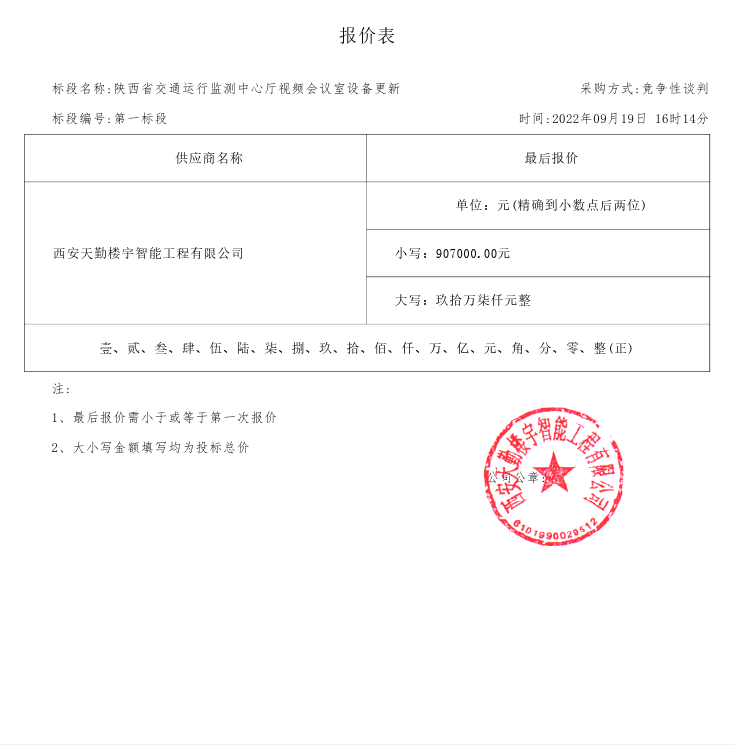 2022年9月21日陕西省交通运行监测中心厅视频会议室设备更新中标(成交)结果公告 |
