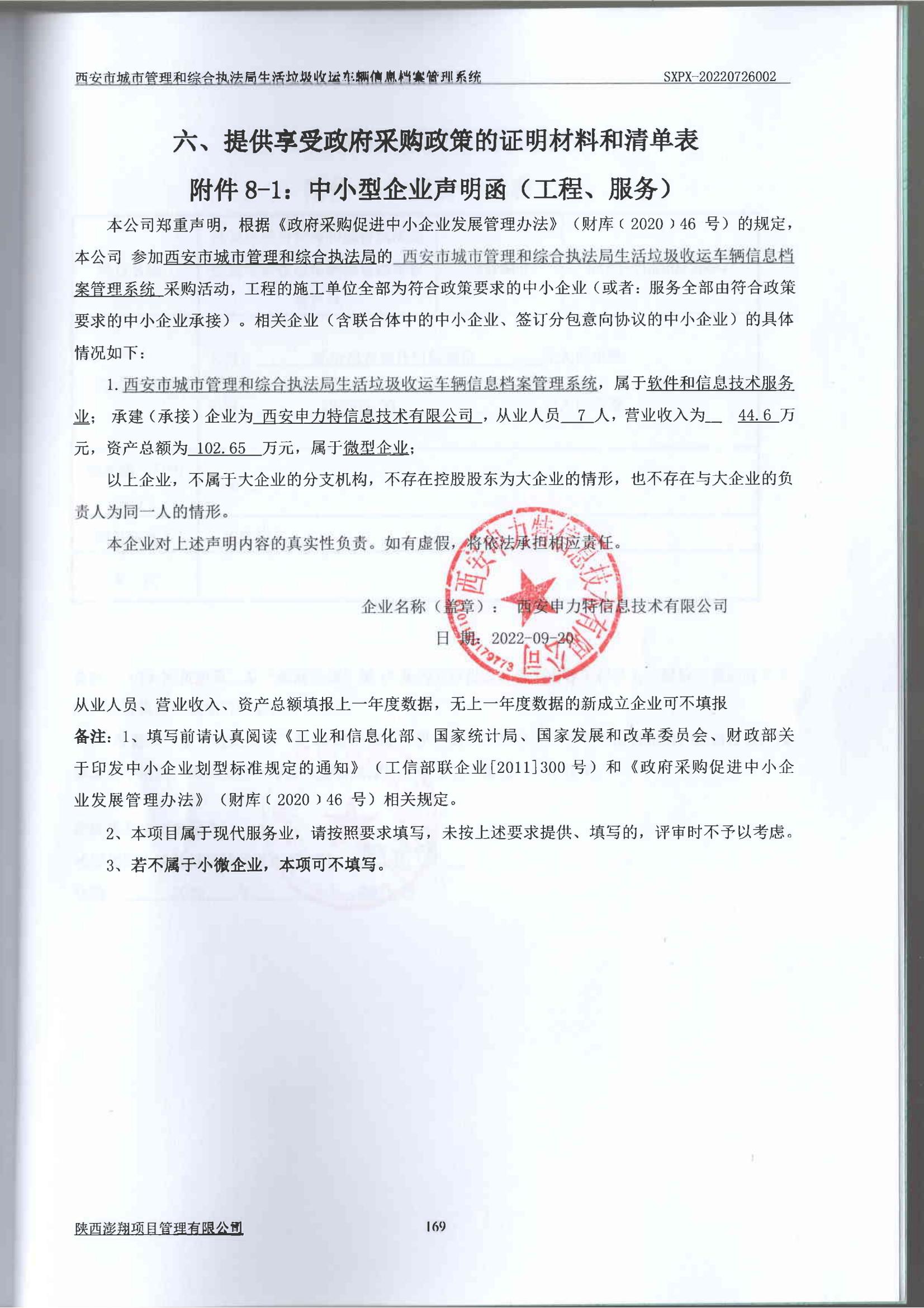 自本公告发布之日起1个工作日。 八、其他补充事宜无 九、凡对本次公告内容提出询问,请按以下方式联系。 1.采购人信息名称:西安市城市管理和综合执法局 地址:陕西省西安市凤城八路109号 联系方式:029-86783606 2.采购代理机构信息名称:陕西澎翔项目管理有限公司 地址:陕西省西安市未央区陕西省西安市未央区永庆路168号1幢百寰国际1707室 联系方式:029-81717955 3.项目联系方式项目联系人:罗杨 电话:029-81717955 陕西澎翔项目管理有限公司 2022年09月21日 相关附件: 磋商文件终稿-生活垃圾收运车辆信息档案管理系统202209131659.pdf 陕西申力特中小企业声明函_00.jpg 西安市城市管理和综合执法局生活垃圾收运车辆信息档案管理系统中标(成交)明细.pdf 十一、其他事项: ------------------------------------招标信息结束---------------------------- 标签: 中标 西安市 城市管理 生活垃圾 执法局 车辆 档案管理系统 上一篇: 2022年9月21日怀来县教育体育和科学技术局落实“蛋奶工程”、“营养改善计划”采购鸡蛋项目中标公告 最新5000条招标信息列表: 滚动招标 |