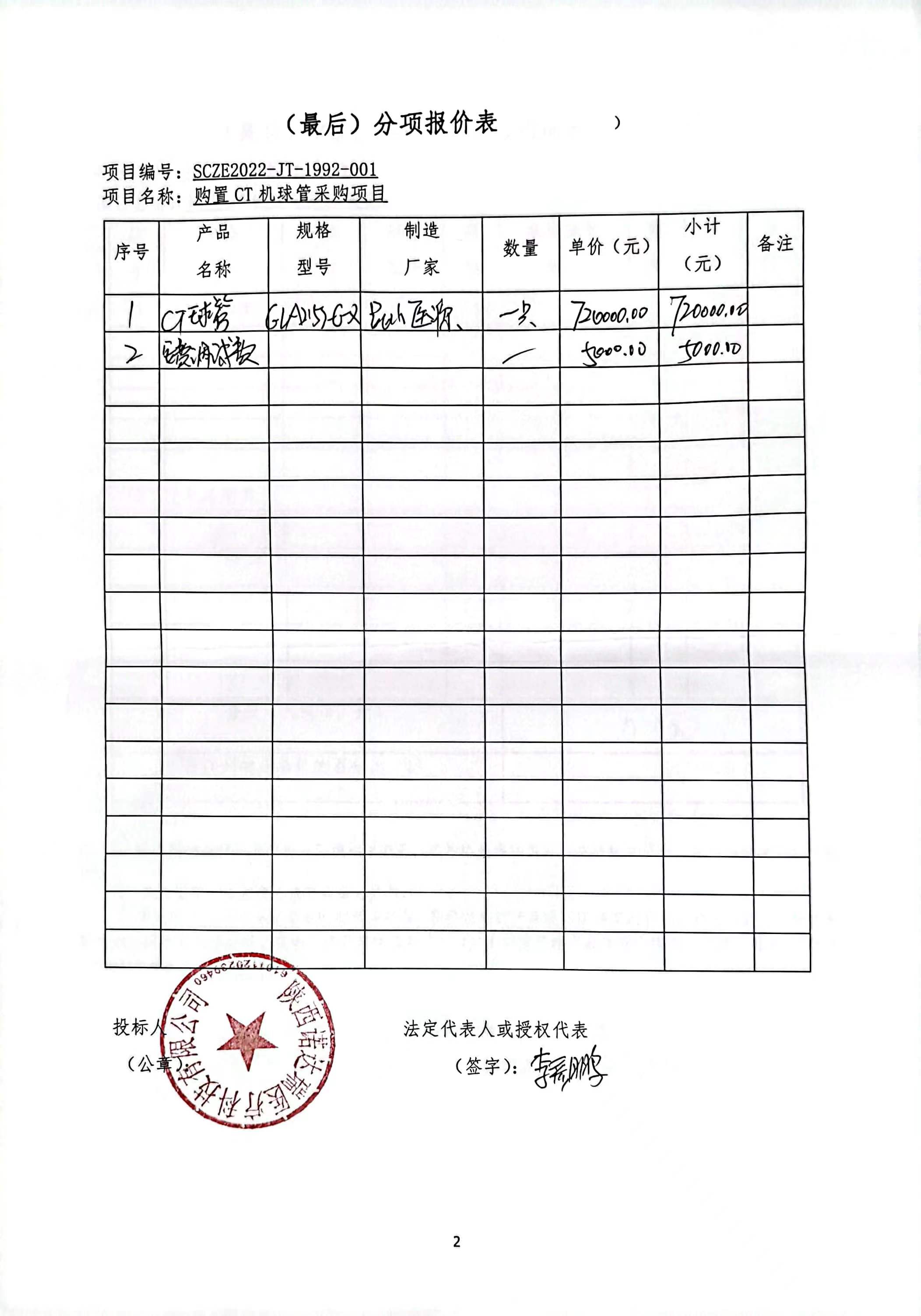 ----------------------------------招标机构发布信息原文:----------------------- <meta http-equiv="content-type" content="text/html;charset=utf-8"> 一、项目编号:SCZE2022-JT-1992-001 二、项目名称:购置CT机球管采购项目 三、采购结果 合同包1(购置CT机球管采购项目):