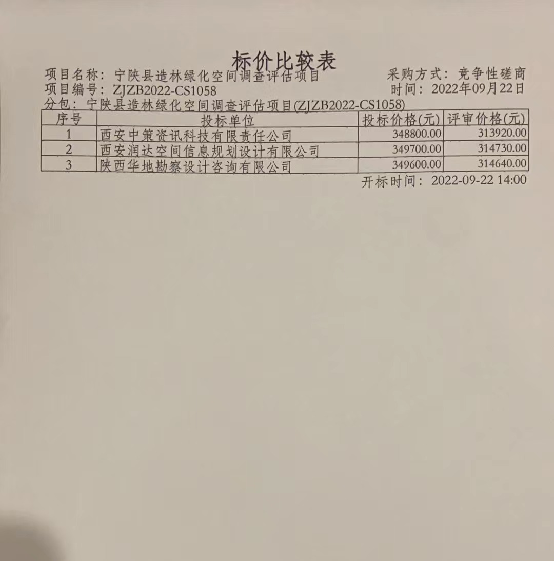 2022年9月26日宁陕县林业局宁陕县造林绿化空间调查评估中标(成交)结果公告 |