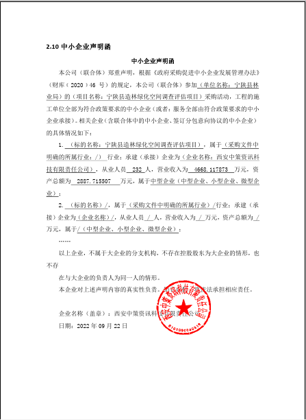 自本公告发布之日起1个工作日。 八、其他补充事宜无 九、凡对本次公告内容提出询问,请按以下方式联系。 1.采购人信息名称:宁陕县林业局 地址:宁陕县迎宾大道33号 联系方式:0915-6822619 2.采购代理机构信息名称:陕西中基项目管理有限公司 地址:陕西省西安市雁塔区陕西省西安市高新区高新路52号高科大厦17F 联系方式:029-88336376 3.项目联系方式项目联系人:曾工、高工 电话:029-88336376 陕西中基项目管理有限公司 2022年09月26日 相关附件: (9.1 定稿) CS1058宁陕县造林绿化空间调查评估项目.doc 宁陕县林业局宁陕县造林绿化空间调查评估中标(成交)明细.pdf 二次报价.jpg 中小企业声明函.png 十一、其他事项: ------------------------------------招标信息结束---------------------------- 标签: 中标 宁陕县 林业局 公告 空间 上一篇: 2022年9月26日西安市应急管理局(本级)办公用房续租项目中标(成交)结果公告 最新5000条招标信息列表: 滚动招标 |