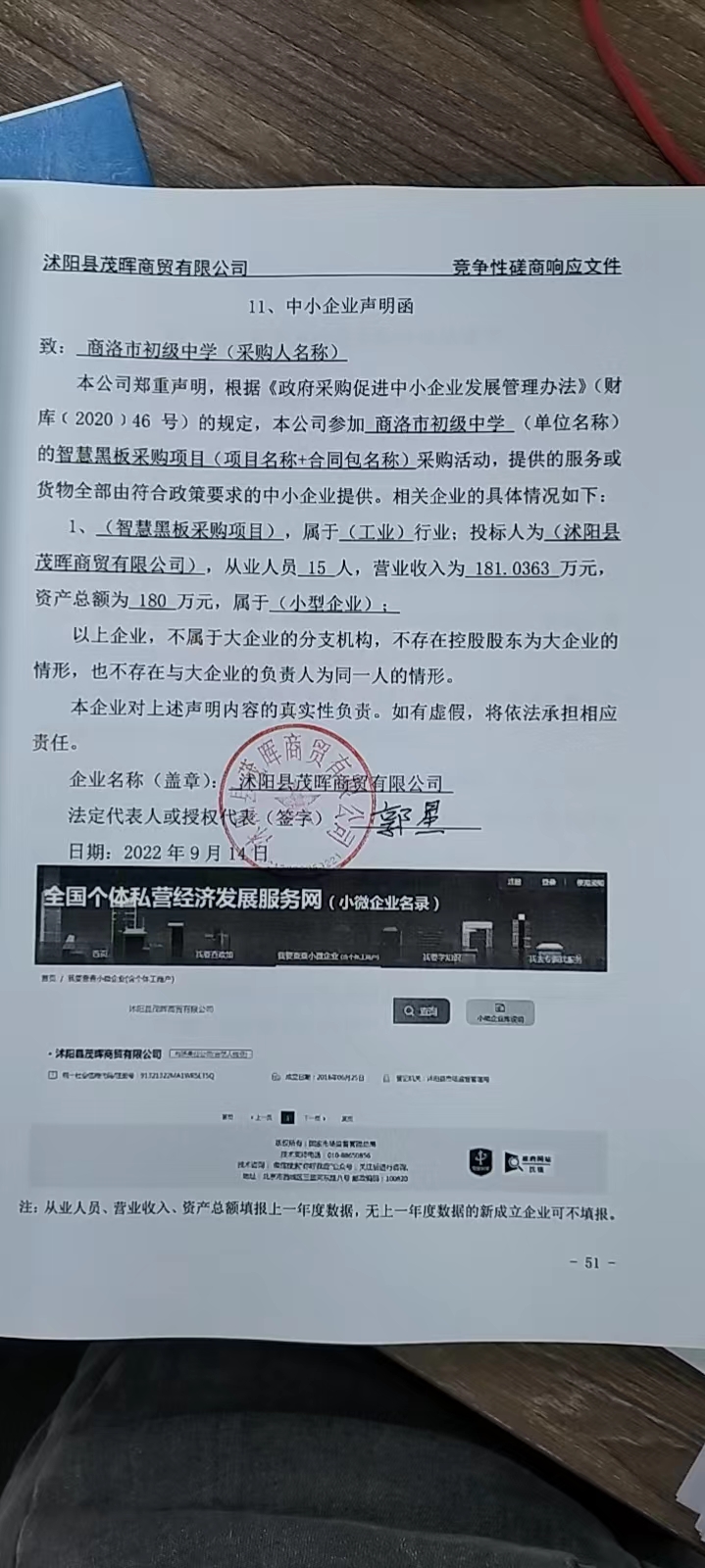 合同包1(商洛市初级中学智慧黑板采购项目): 货物类(沭阳县茂晖商贸有限公司)