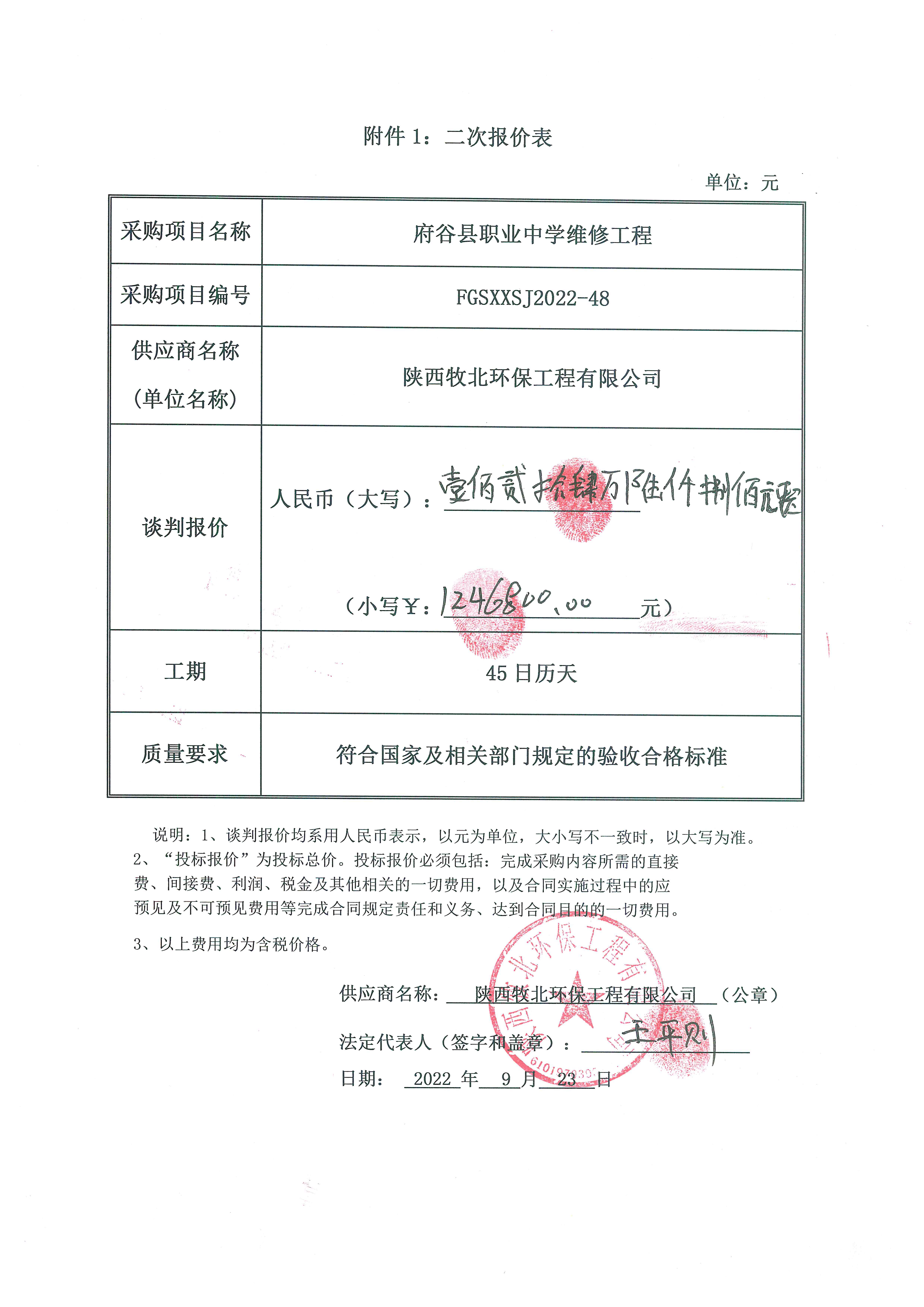 合同包1(府谷县职业中学维修工程): 工程类(陕西牧北环保工程有限公司)