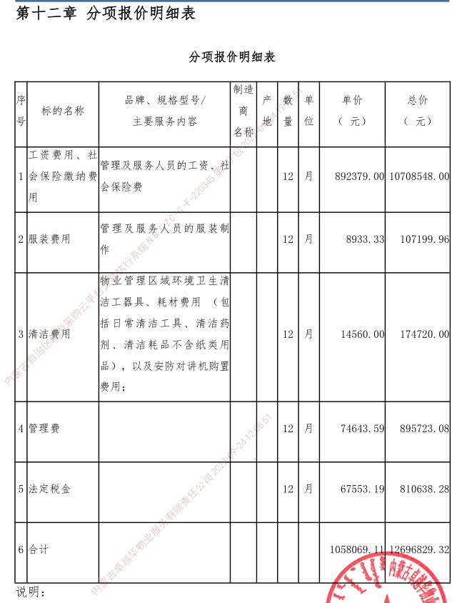 曹丽鲜、史隆芳、田磊(采购人代表)、王福玲、强莉平、郭建明、贾荣阁(采购人代表) 六、代理服务收费标准及金额:代理服务费收费标准: 无 代理服务费金额: 合同包1(物业管理服务): 0万元。收取对象:无。 七、公告期限自本公告发布之日起1个工作日。 八、其他补充事宜无 九、凡对本次公告内容提出询问,请按以下方式联系。 1.采购人信息名称:内蒙古自治区中医医院 地址:内蒙古自治区呼和浩特市新城区健康街11号 联系方式:0471-6921317 2.采购代理机构信息名称:内蒙古自治区公共资源交易中心 地址:内蒙古自治区呼和浩特市赛罕区敕勒川大街6号 联系方式:0471-5332614 3.项目联系方式项目联系人:李倩 电话:0471-5332640 内蒙古自治区公共资源交易中心 2022年09月26日 相关附件: 物业服务报价明细附件.pdf 分项报价明细表.jpg 十一、其他事项: ------------------------------------招标信息结束---------------------------- 标签: 内蒙古自治区 物业服务 中医医院 公告 上一篇: 2022年9月26日哈尔滨市道里区工业信息科技局关于招标常态化疫情防控防疫物资代理采购供应商(二次)结果公告 最新5000条招标信息列表: 滚动招标 |