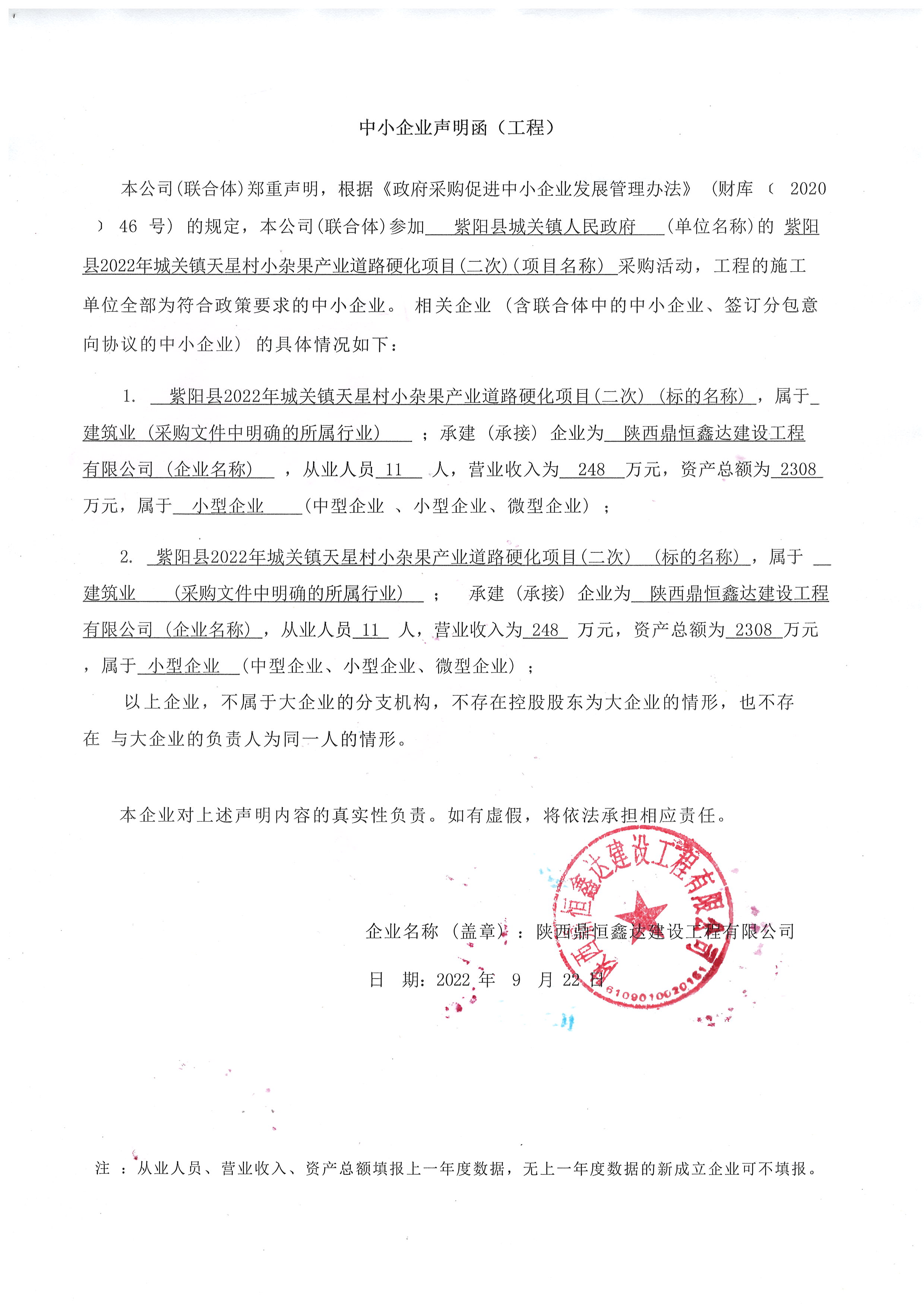 合同包1(紫阳县2022年城关镇天星村小杂果产业道路硬化项目(二次)): 工程类(陕西鼎恒鑫达建设工程有限公司)
