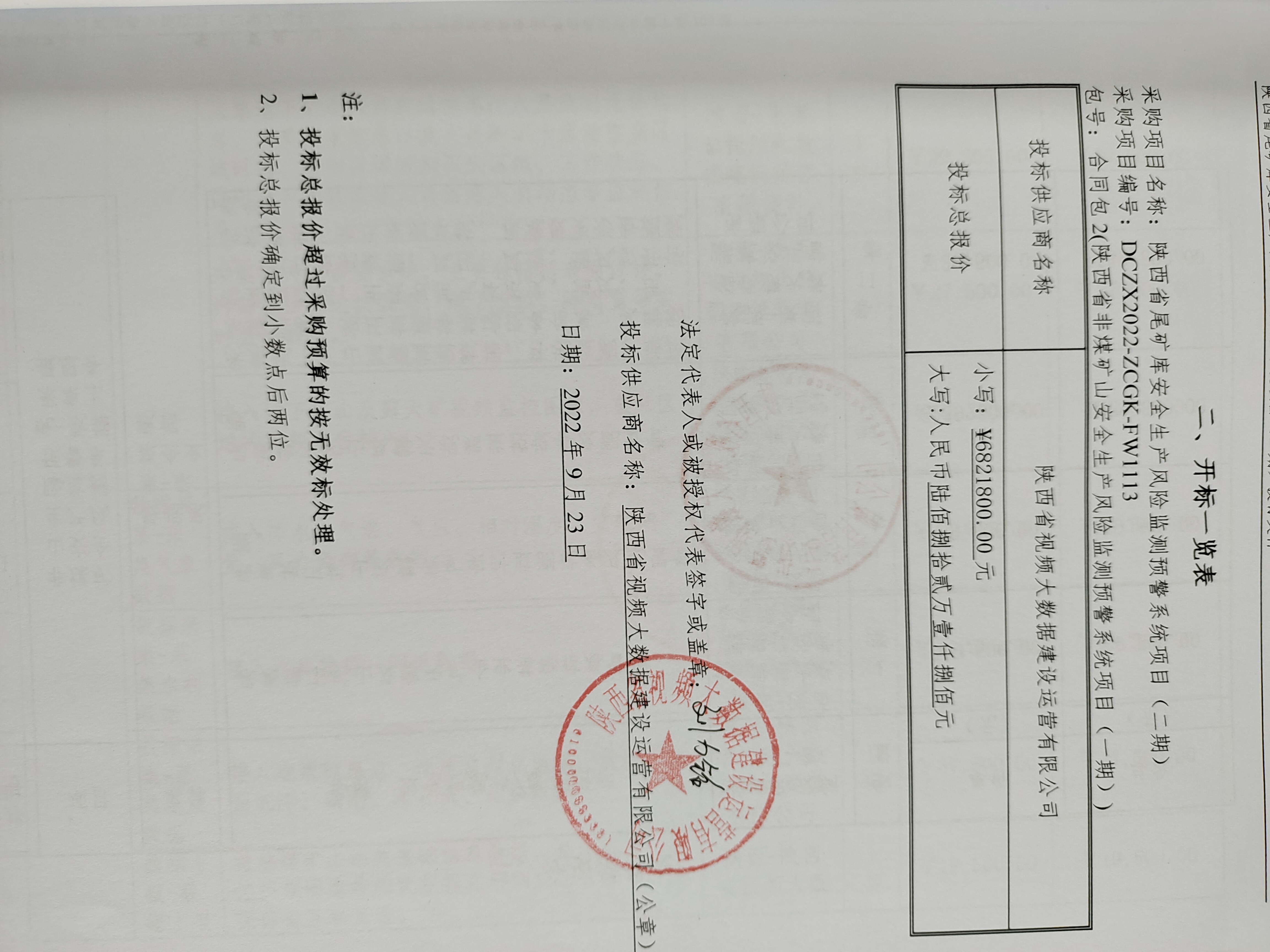 合同包2(陕西省非煤矿山安全生产风险监测预警系统项目(一期)): 服务类(陕西省视频大数据建设运营有限公司)