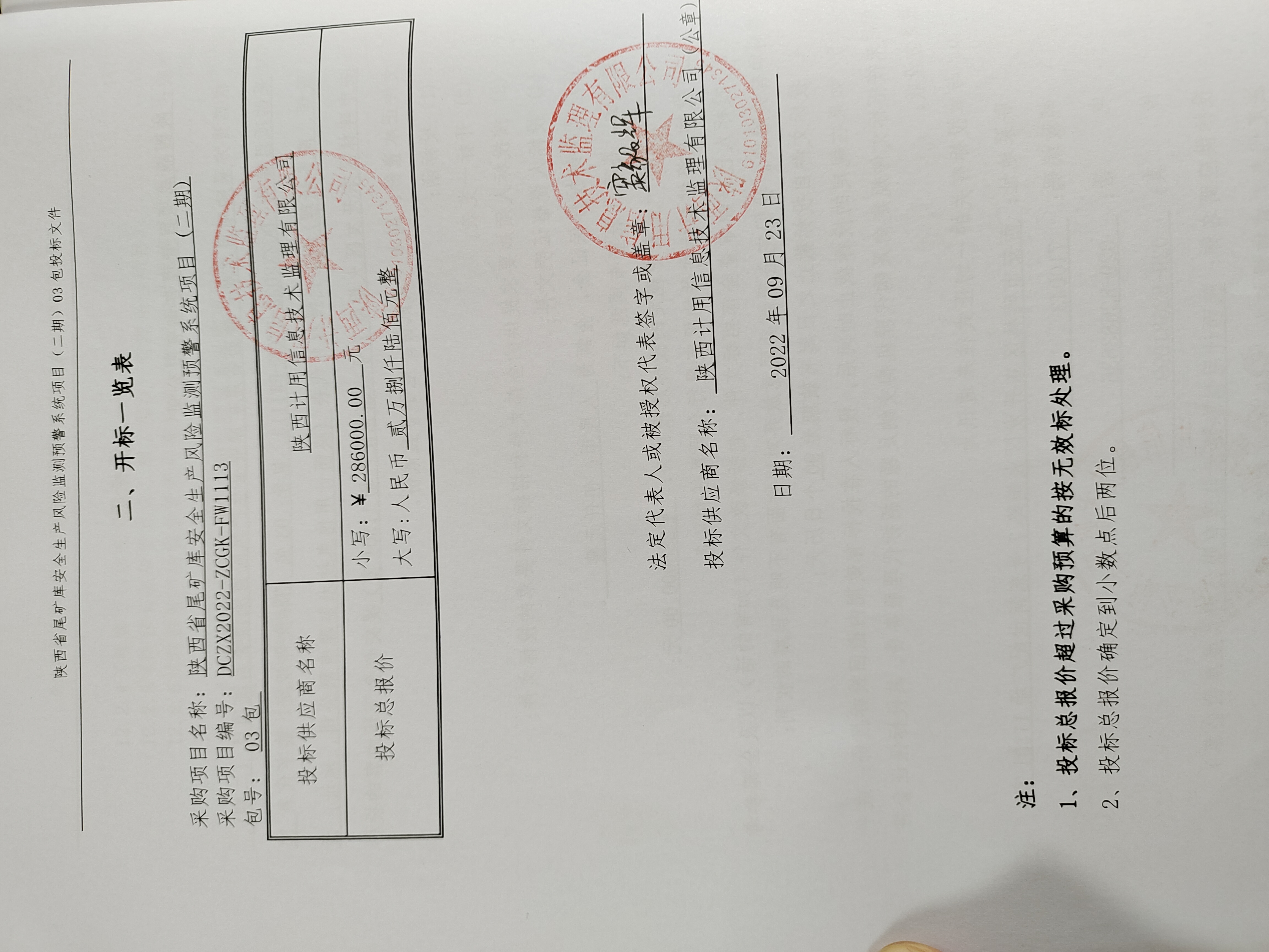 自本公告发布之日起1个工作日。 八、其他补充事宜/ 九、凡对本次公告内容提出询问,请按以下方式联系。 1.采购人信息名称:陕西省应急管理厅 地址:西安市未央区未央路208号 联系方式:029-61166256 2.采购代理机构信息名称:陕西鼎成项目管理咨询有限公司 地址:陕西省西安市高新区高新路88号尚品国际B座7层703室 联系方式:029-81773523 3.项目联系方式项目联系人:彭宏飞、强勃红、马瑞 电话:029-81773523 陕西鼎成项目管理咨询有限公司 2022年09月27日 相关附件: 陕西省应急管理厅陕西省尾矿库安全生产风险监测预警系统项目(二期)中标(成交)明细.pdf 合同包1-报价表.jpg 合同包2-报价表.jpg 合同包3-报价表.jpg 合同包3-中小企业声明函.jpg 招标文件.pdf 合同包1-分项报价表.pdf 合同包2-分项报价表.pdf 合同包3-分项报价表.jpg 十一、其他事项: ------------------------------------招标信息结束---------------------------- 标签: 中标 项目 陕西省 尾矿 二期 安全生产 预警系统 上一篇: 2022年9月27日青岛市中医医院(市海慈医院)癫痫视频脑电检测系统中标公告 最新5000条招标信息列表: 滚动招标 |