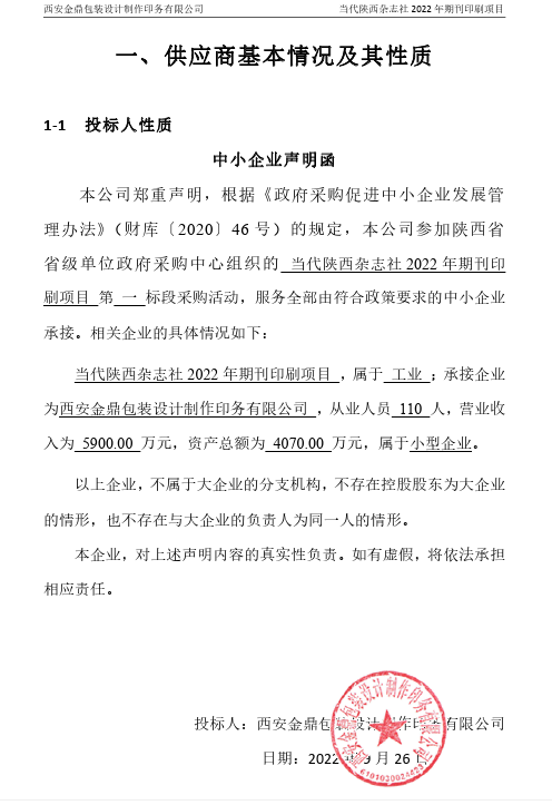 自本公告发布之日起1个工作日。 八、其他补充事宜无 九、凡对本次公告内容提出询问,请按以下方式联系。 1.采购人信息名称:当代陕西杂志社 地址:西安市雁塔路南段10号 联系方式:029-85589979 2.采购代理机构信息名称:陕西省省级单位政府采购中心 地址:西安市碑林区长安北路14号 联系方式:029-88661306 3.项目联系方式项目联系人:王芸熙 电话:029-88661306 陕西省省级单位政府采购中心 2022年09月27日 相关附件: 金鼎第一标段中小企业声明函.png 界龙印务第二标段中小企业声明函.png 当代陕西杂志社2022年期刊印刷项目中标(成交)明细.pdf 金鼎第一标段分项报价表.png 界龙印务第二标段分项报价表.png 十一、其他事项: ------------------------------------招标信息结束---------------------------- 标签: 项目 中标 陕西 杂志社 当代 期刊 公告 上一篇: 2022年9月27日乌兰察布市草原工作站察右中旗辉腾锡勒道路边坡客土喷播服务结果公告 最新5000条招标信息列表: 滚动招标 |