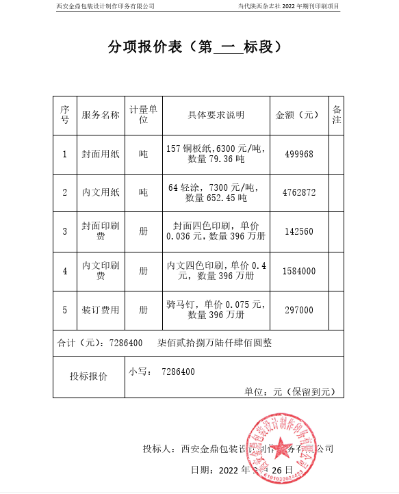 合同包1(当代陕西杂志社2022年期刊印刷项目(一)): 服务类(西安金鼎包装设计制作印务有限公司)