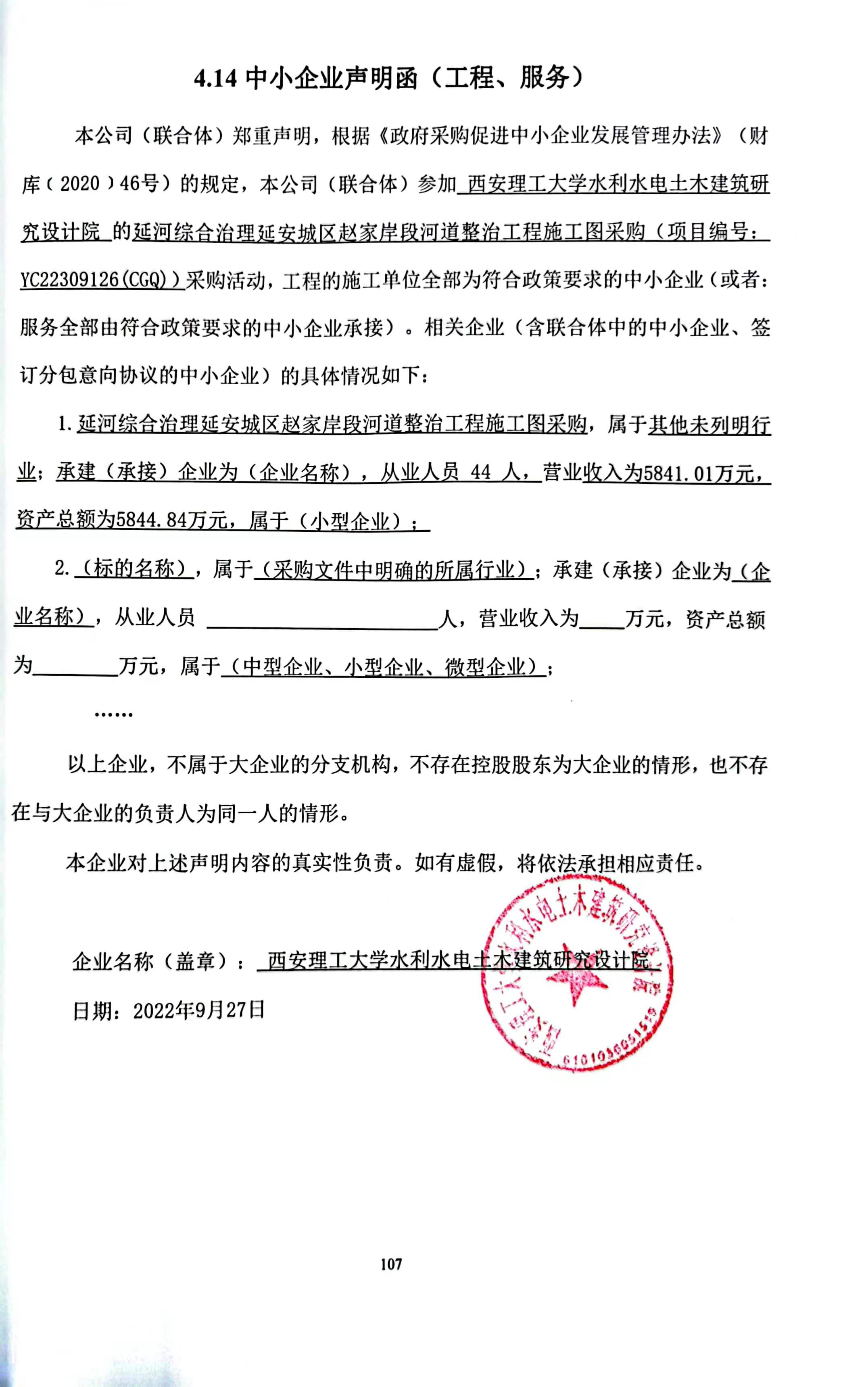 自本公告发布之日起1个工作日。 八、其他补充事宜无 九、凡对本次公告内容提出询问,请按以下方式联系。 1.采购人信息名称:延安市市区河道管理处 地址:陕西省延安市宝塔区文化沟水务局 联系方式:杨工18009111314 2.采购代理机构信息名称:亿诚建设项目管理有限公司 地址:陕西省西安市雁塔区吉祥路135号 联系方式:15291110058 3.项目联系方式项目联系人:张耀峰 电话:15291110058 亿诚建设项目管理有限公司 2022年09月28日 相关附件: 延安市市区河道管理处延河综合治理延安城区赵家岸段河道整治工程施工图采购中标(成交)明细.pdf 【磋商文件】延河综合治理延安城区赵家岸段河道整治工程施工图采购.docx 中小企业声明函.jpg 十一、其他事项: ------------------------------------招标信息结束---------------------------- 标签: 采购 延安 工程 中标 河道 延安市 延河 上一篇: 2022年9月28日中共宁陕县委党校配套设施建设项目四标段中标(成交)结果公告 最新5000条招标信息列表: 滚动招标 |