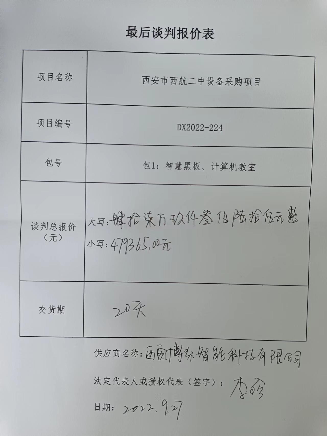 自本公告发布之日起1个工作日。 八、其他补充事宜/ 九、凡对本次公告内容提出询问,请按以下方式联系。 1.采购人信息名称:西安市西航二中 地址:西安市未央区徐家湾渭清路12号 联系方式:西安市西航二中经办029-86628703 2.采购代理机构信息名称:陕西笃信招标有限公司 地址:西安经济技术开发区凤城十一路与文景路十字文景商务广场B座8层 联系方式:029-86253389 3.项目联系方式项目联系人:郭晨、李纪旋 电话:029-86253389 陕西笃信招标有限公司 2022年09月28日 相关附件: 西安市西航二中设备采购项目中标(成交)明细.pdf 最后谈判报价表.jpg 224(包1)西安市西航二中设备采购项目(定稿).doc 十一、其他事项: ------------------------------------招标信息结束---------------------------- 标签: 项目 西安市 黑板 二中 设备采购 教室 智慧 上一篇: 2022年9月28日惠东县农业技术推广中心2022年县级财政普查和扑杀红火蚁疫情项目红火蚁防控药剂采购结果公告 最新5000条招标信息列表: 滚动招标 |