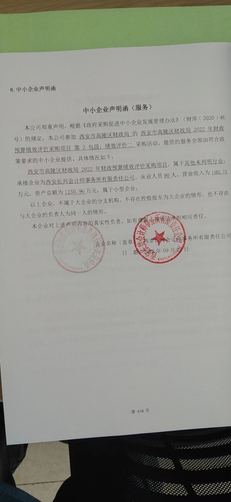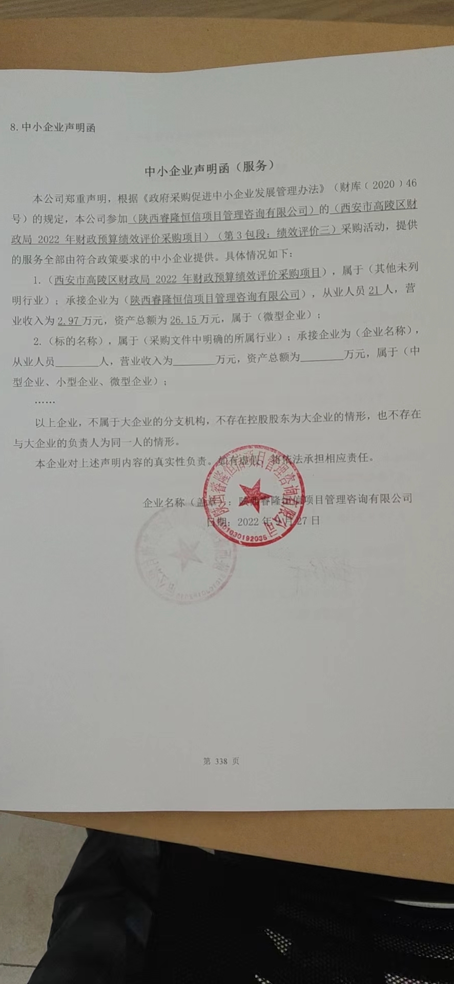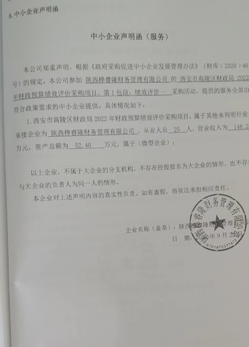 自本公告发布之日起1个工作日。 八、其他补充事宜无 九、凡对本次公告内容提出询问,请按以下方式联系。 1.采购人信息名称:西安市高陵区财政局 地址:高陵区南环西路189号 联系方式:029-86910537 2.采购代理机构信息名称:陕西顶诚招标有限公司 地址:陕西省西安市灞桥区长乐东路2999号京都国际2号楼29层2902号房 联系方式:029-83479858-802 3.项目联系方式项目联系人:雷敏 黄建峰 王景华 电话:029-83479858-802 陕西顶诚招标有限公司 2022年09月28日 相关附件: 西安市高陵区财政局2022年财政预算绩效评价项目中标(成交)明细.pdf 第1包-中小企业声明函.jpg 第2包-中小企业声明函.jpg 第3包-中小企业声明函.jpg 西安市高陵区财政局2022年财政预算绩效评价项目-磋商文件定稿0915.pdf 十一、其他事项: ------------------------------------招标信息结束---------------------------- 标签: 高陵 中标 项目 财政局 西安市 财政预算 绩效评价 上一篇: 2022年9月28日正镶白旗宝力根陶海苏木人民政府正镶白旗宝力根陶海苏木贡淖嘎查发展壮大集体经济项目结果公告 最新5000条招标信息列表: 滚动招标 |