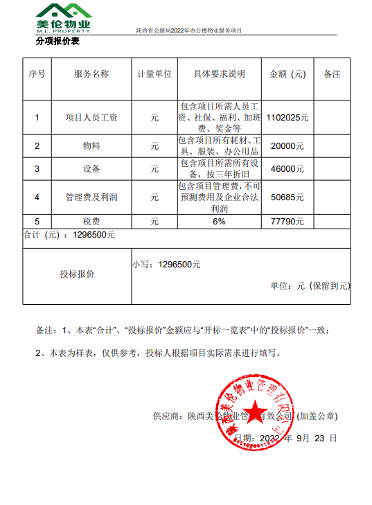 合同包1(陕西省公路局2022年办公楼物业服务项目): 服务类(陕西美伦物业管理有限公司)