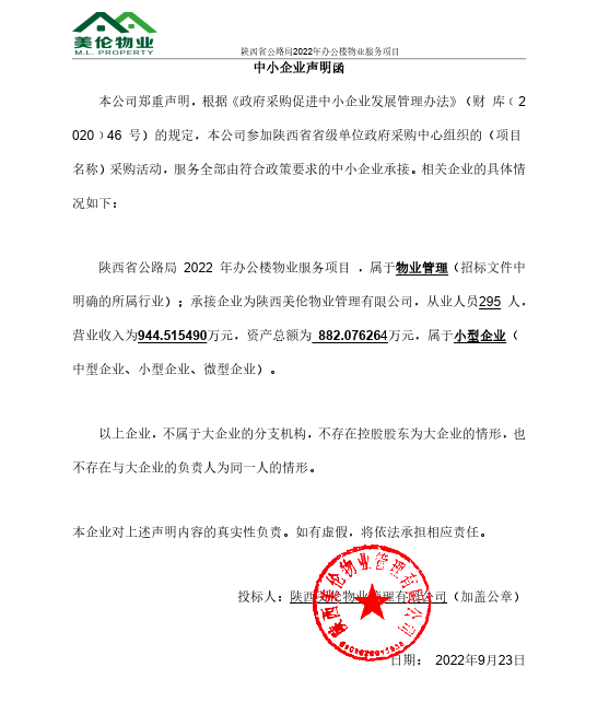 自本公告发布之日起1个工作日。 八、其他补充事宜专门面向中小企业 九、凡对本次公告内容提出询问,请按以下方式联系。 1.采购人信息名称:陕西省公路局 地址:西安市含光北路110号 联系方式:029-88408786 2.采购代理机构信息名称:陕西省省级单位政府采购中心 地址:西安市碑林区长安北路14号 联系方式:029-88661361 3.项目联系方式项目联系人:杨丹 电话:029-88661361 陕西省省级单位政府采购中心 2022年09月28日 相关附件: 陕西省公路局2022年办公楼物业服务项目中标(成交)明细.pdf 分项报价表.png 小微企业声明函.png 十一、其他事项: ------------------------------------招标信息结束---------------------------- 标签: 中标 陕西省 公路局 办公楼 服务项目 物业 公告 上一篇: 2022年9月28日徐庄镇2022年徐庄镇徐庄村“百年大集”提升建设项目中标(成交)公告 最新5000条招标信息列表: 滚动招标 |