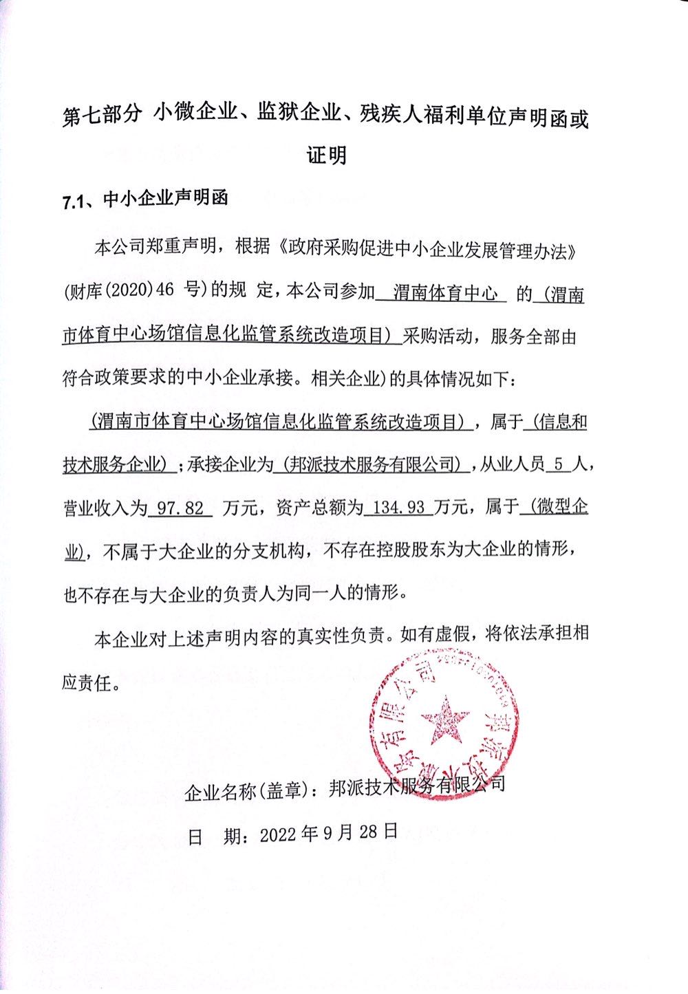 自本公告发布之日起1个工作日。 八、其他补充事宜无 九、凡对本次公告内容提出询问,请按以下方式联系。 1.采购人信息名称:渭南市体育中心 地址:渭南市临渭区乐天大街与渭清路十字西北角 联系方式:0913-3035711 2.采购代理机构信息名称:陕西省采购招标有限责任公司 地址:西安市高新二路2号山西证券大厦8层 联系方式:029-88481271 3.项目联系方式项目联系人:熊磊、刘艳 电话:029-88481271 陕西省采购招标有限责任公司 2022年09月29日 相关附件: 渭南市体育中心场馆信息化监管系统改造项目中标(成交)明细.pdf 渭南市体育中心场馆信息化监管系统改造项目竞争性磋商文件.docx 渭南市体育中心场馆信息化监管系统改造项目竞争性磋商文件分项.docx 中小企业声明函.jpg 十一、其他事项: ------------------------------------招标信息结束---------------------------- 标签: 渭南市 场馆 体育中心 改造项目 公告 系统 上一篇: 2022年9月29日奈曼旗新镇人民政府2022年新镇扶持发展壮大集体经济项目结果公告 最新5000条招标信息列表: 滚动招标 |