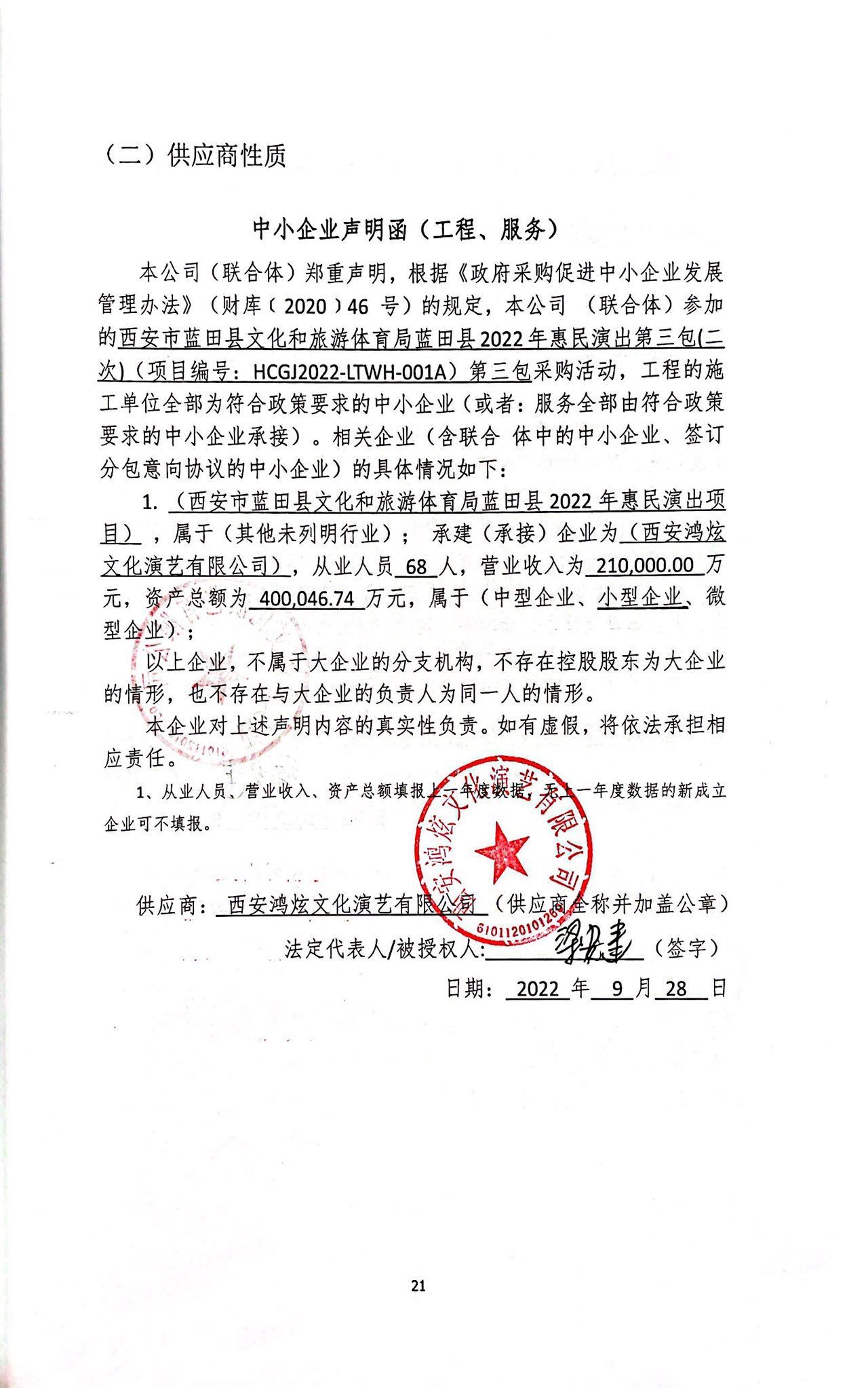 自本公告发布之日起1个工作日。 八、其他补充事宜无 九、凡对本次公告内容提出询问,请按以下方式联系。 1.采购人信息名称:西安市蓝田县文化和旅游体育局(本级) 地址:蓝田县政府大院 联系方式:13679222024 2.采购代理机构信息名称:红城国际工程项目管理有限公司 地址:陕西省西安市雁塔区陕西省西安市高新区高新六路21号CROSS万象汇6幢1单元7层 联系方式:赵锦天、刘晶 18629147579、18192088901 3.项目联系方式项目联系人:赵锦天、刘晶 电话:18629147579、18192088901 邮箱: ttzxx0811@126.com 红城国际工程项目管理有限公司 2022年09月29日 相关附件: 西安市蓝田县文化和旅游体育局(本级)蓝田县2022年惠民演出第三包(二次)中标(成交)明细.pdf 中小企业声明函.jpg 十一、其他事项: ------------------------------------招标信息结束---------------------------- 标签: 中标 惠民 蓝田县 体育局 西安市 三包 演出 上一篇: 2022年9月29日望奎县林业和草原局村屯绿化结果公告 最新5000条招标信息列表: 滚动招标 |