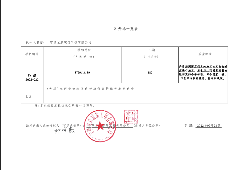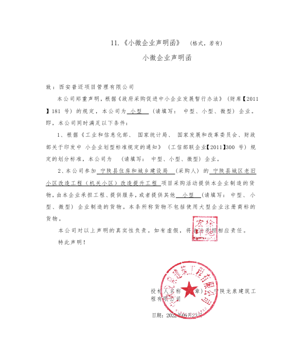 自本公告发布之日起1个工作日。 八、其他补充事宜/ 九、凡对本次公告内容提出询问,请按以下方式联系。 1.采购人信息名称:宁陕县住房和城乡建设局 地址:宁陕县豪迈客运站4楼 联系方式:武主任 13909157982 2.采购代理机构信息名称:西安普迈项目管理有限公司 地址:安康市高新区万象公馆703室 联系方式:15609156011 3.项目联系方式项目联系人:黄蓉 电话:15609156011 西安普迈项目管理有限公司 2022年09月29日 相关附件: 机关小区 小微企业声明函.png 开标一览表.png 宁陕县住房和城乡建设局宁陕县城区老旧小区改造工程(机关小区)改造提升工程中标(成交)明细.pdf 十一、其他事项: ------------------------------------招标信息结束---------------------------- 标签: 中标 工程 宁陕县 建设局 小区 城乡 改造工程 上一篇: 2022年9月29日济南市儿童医院济南市儿童医院疫情防控智慧通行管控系统扩容项目 三次招标中标公告 最新5000条招标信息列表: 滚动招标 |