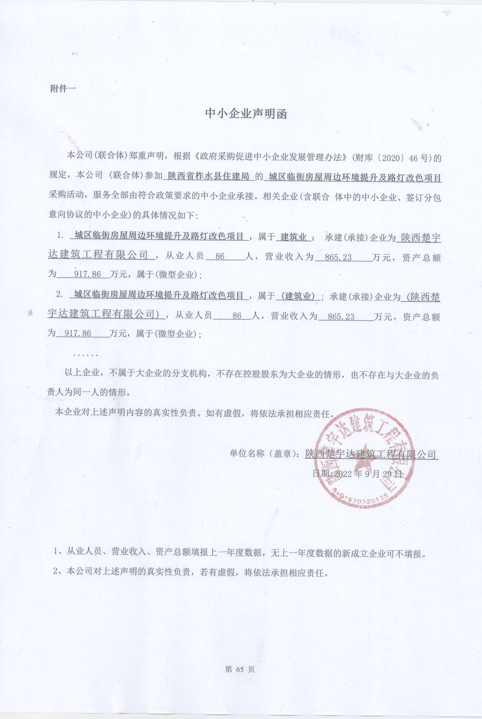 合同包1(城区临街房屋周边环境提升及路灯改色项目): 工程类(陕西楚宇达建筑工程有限公司)