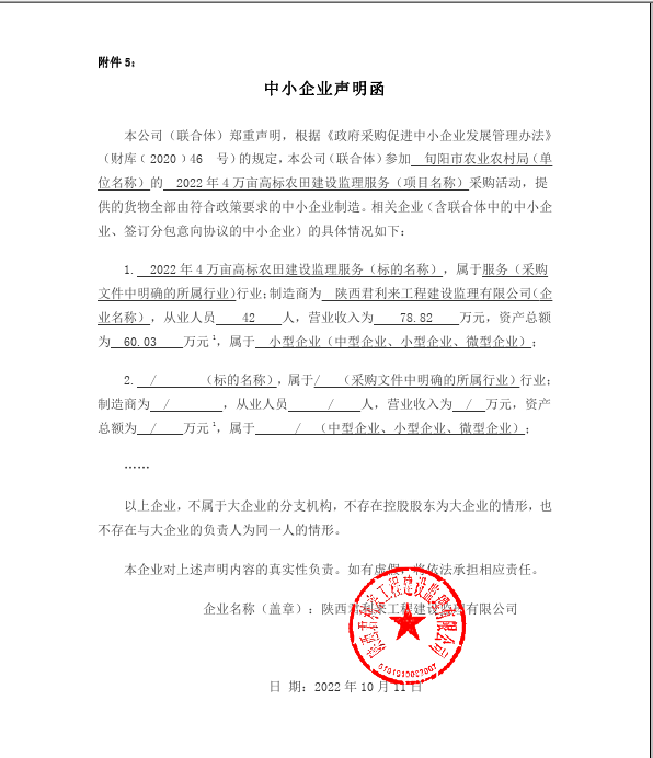 自本公告发布之日起1个工作日。 八、其他补充事宜无 九、凡对本次公告内容提出询问,请按以下方式联系。 1.采购人信息名称:旬阳市农业农村局 地址:旬阳县健康路94号 联系方式:18609159391 2.采购代理机构信息名称:正大鹏安建设项目管理有限公司 地址:旬阳市政务服务中心对面三楼302室 联系方式:15191530662 3.项目联系方式项目联系人:王工 电话:15191530662 正大鹏安建设项目管理有限公司 2022年10月12日 相关附件: 君利来中小声明函.png 旬阳市农业农村局2022年4万亩高标农田建设监理服务中标(成交)明细.pdf 十一、其他事项: ------------------------------------招标信息结束---------------------------- 标签: 中标 旬阳 农田 建设监理 农村 农业 公告 上一篇: 2022年10月12日郏县住房和城乡建设局河南省平顶山市郏县棚户区改造PPP项目-中标公告 最新5000条招标信息列表: 滚动招标 |