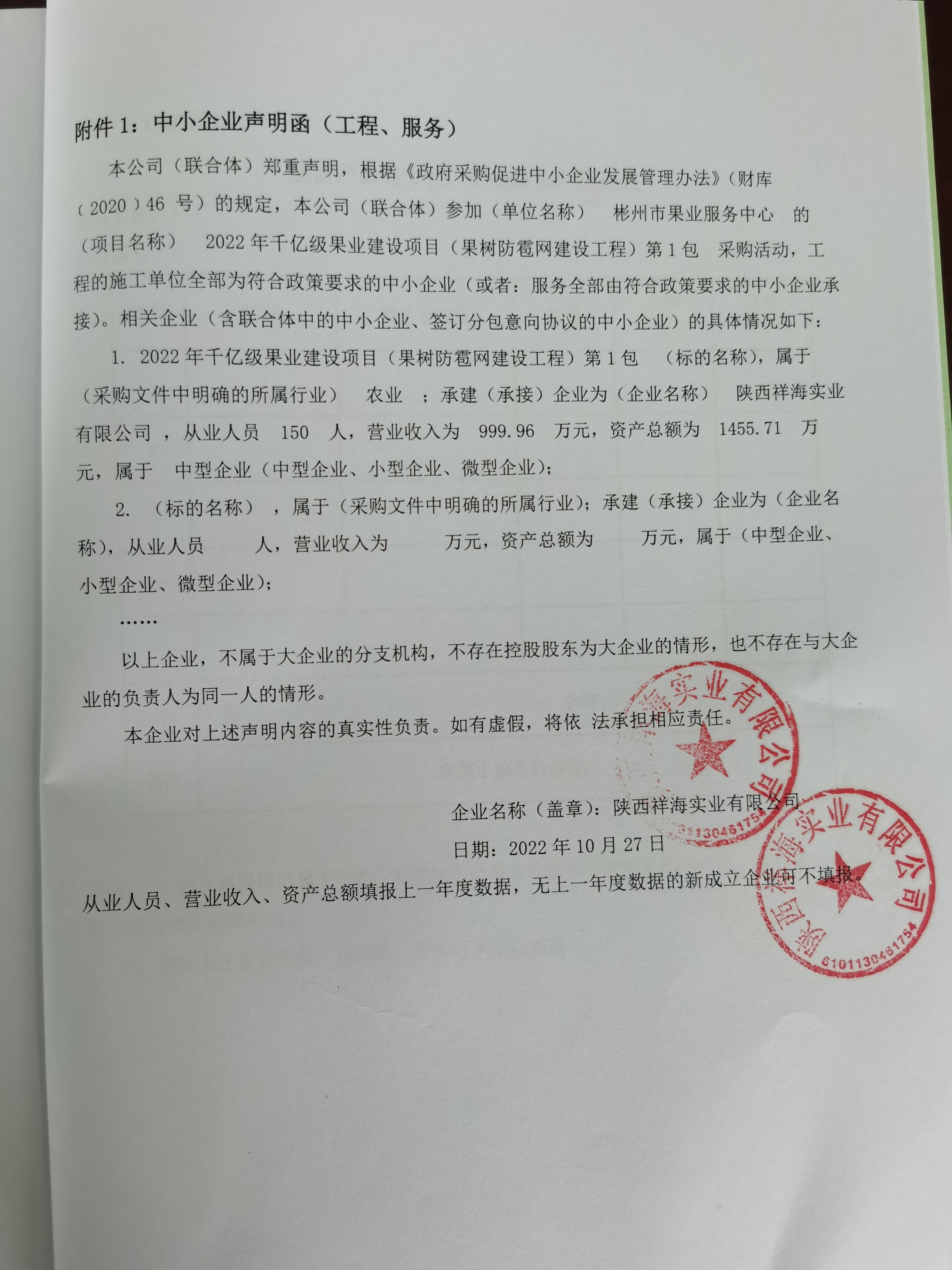 合同包1(2022年千亿级果业建设项目(果树防雹网建设工程)第1包): 工程类(陕西祥海实业有限公司)