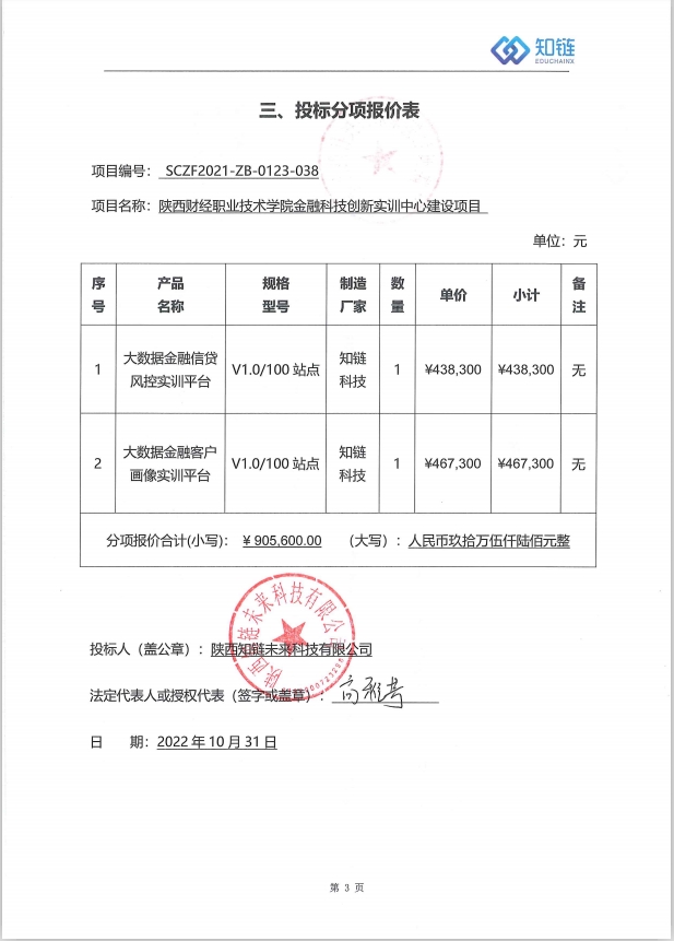 合同包1(陕西财经职业技术学院金融科技创新实训中心建设项目): 货物类(陕西知链未来科技有限公司)