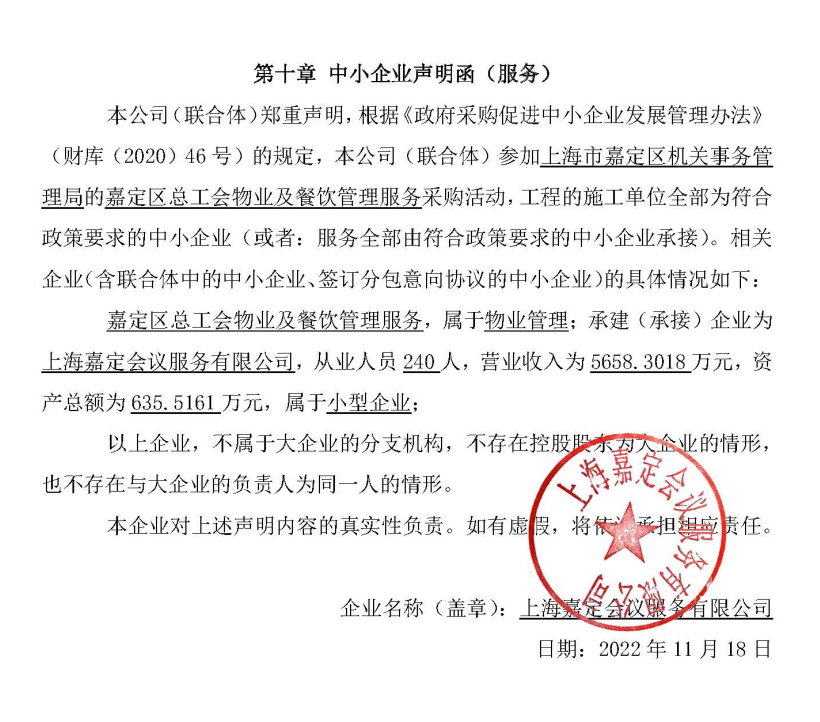 ----------------------------------招标机构发布信息原文:----------------------- 一、项目编号:SHXM-14-20221019-1112 二、项目名称:嘉定区总工会物业及餐饮管理服务 三、中标(成交)信息