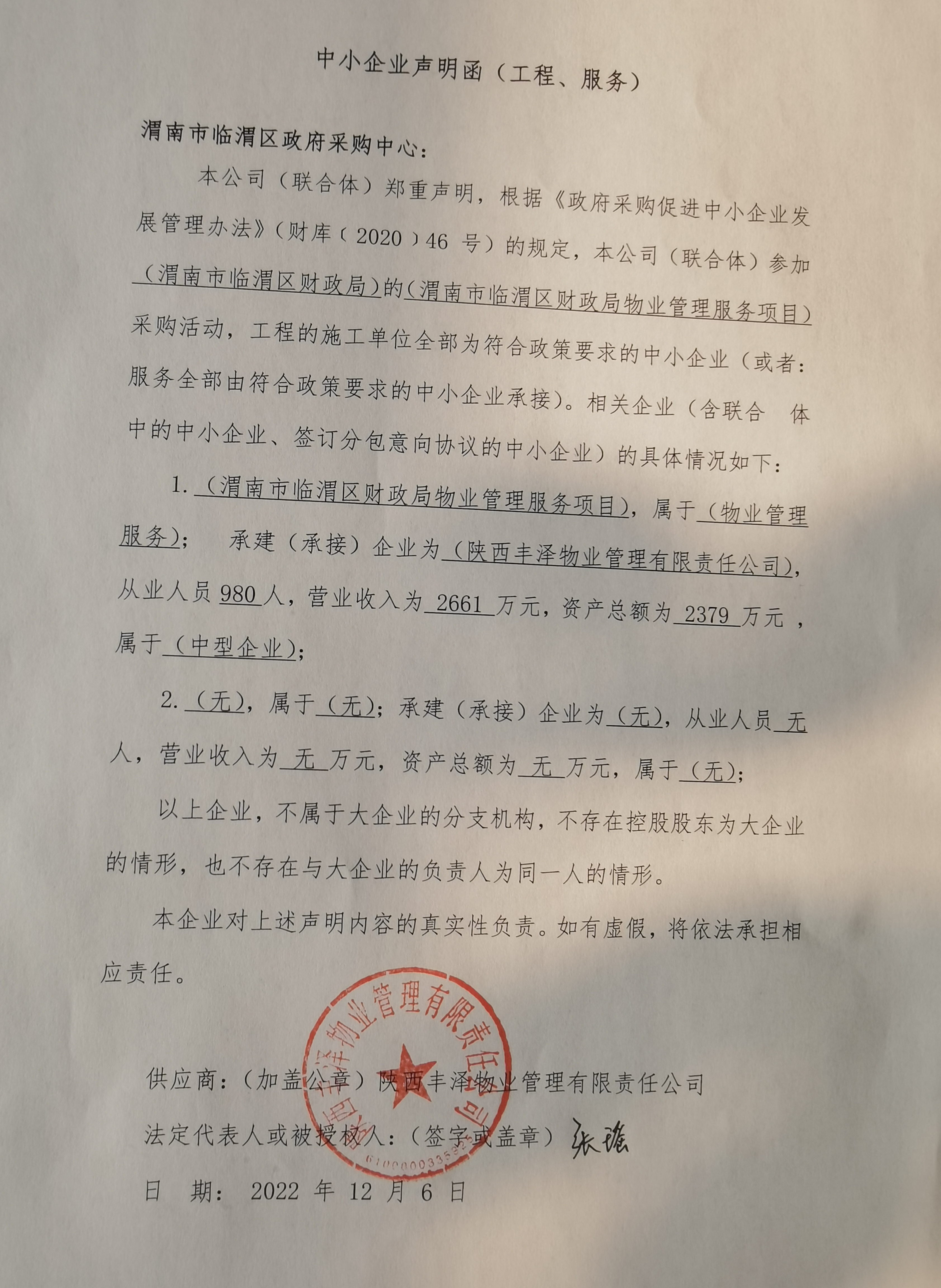 合同包1(渭南市临渭区财政局物业管理服务项目): 服务类(陕西丰泽物业管理有限责任公司)