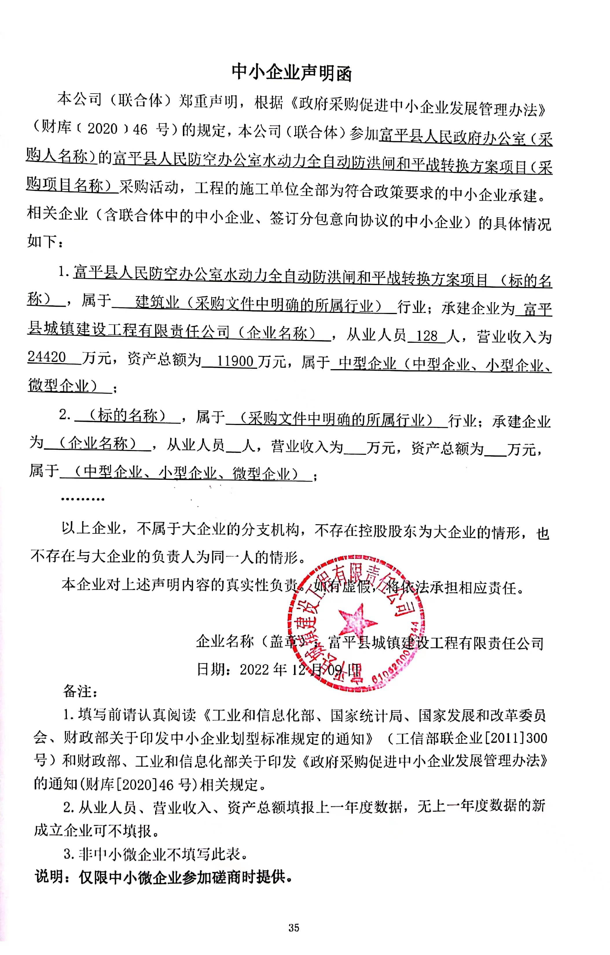 合同包1(富平县人民防空办公室水动力全自动防洪闸和平战转换方案项目): 工程类(富平县城镇建设工程有限责任公司)