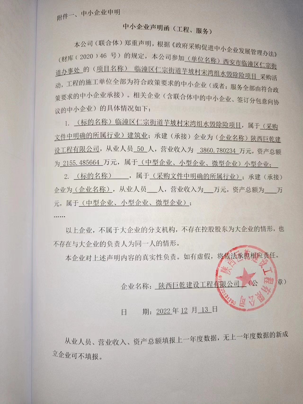 合同包1(临潼区仁宗街道芋坡村宋湾组水毁除险项目): 工程类(陕西巨乾建设工程有限公司)