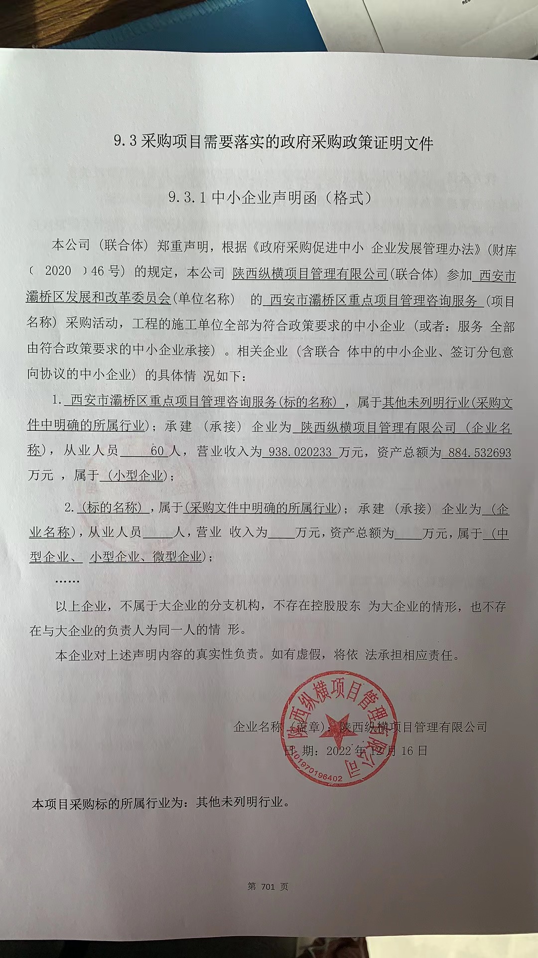 合同包1(西安市灞桥区重点项目管理咨询服务): 服务类(陕西纵横项目管理有限公司)