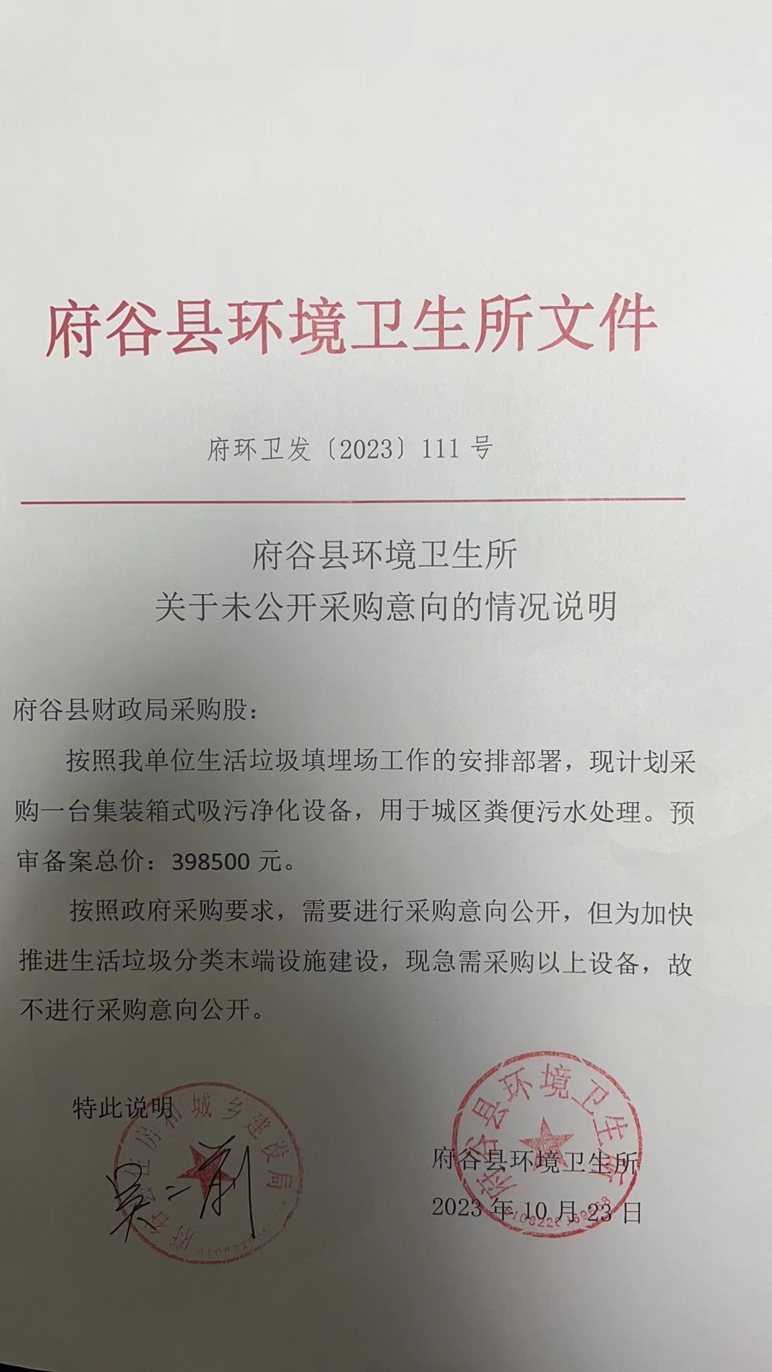 2023年11月3日府谷县环境卫生所采购吸污净化设备项目竞争性谈判公告 |