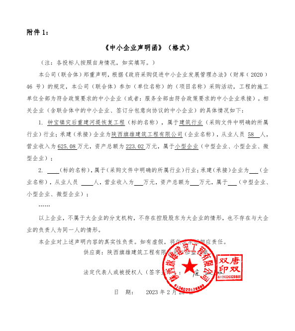 ----------------------------------招标机构发布信息原文:----------------------- 声明函.png 钟宝镇灾后重建河堤恢复工程(1)(1)(2).doc 镇坪县钟宝镇人民政府(本级)钟宝镇灾后重建河堤恢复工程中标(成交)明细.pdf 十一、其他事项: ------------------------------------招标信息结束---------------------------- 标签: 中标 工程 镇坪县 河堤 灾后 公告 钟宝镇 上一篇: 2023年2月21日苏世建设管理集团有限公司关于钦州市第一人民医院东院区一期项目(钦州市公共卫生应急救治中心)崩塌地质灾害隐患治理工程(QZZC2023-G2-10001-SSJT)中标结果公告 最新5000条招标信息列表: 滚动招标 |