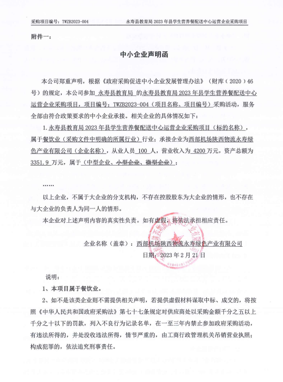 ----------------------------------招标机构发布信息原文:----------------------- 中小企业声明函.png 永寿县教育局2023年县学生营养餐配送中心运营企业采购项目中标(成交)明细.pdf 十一、其他事项: ------------------------------------招标信息结束---------------------------- 标签: 采购 中标 项目 永寿县 教育局 配送中心 营养 上一篇: 2023年2月23日五洲工程顾问集团有限公司关于滨江区图书馆社会化运营项目的中标(成交)结果公告 最新5000条招标信息列表: 滚动招标 |